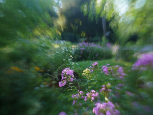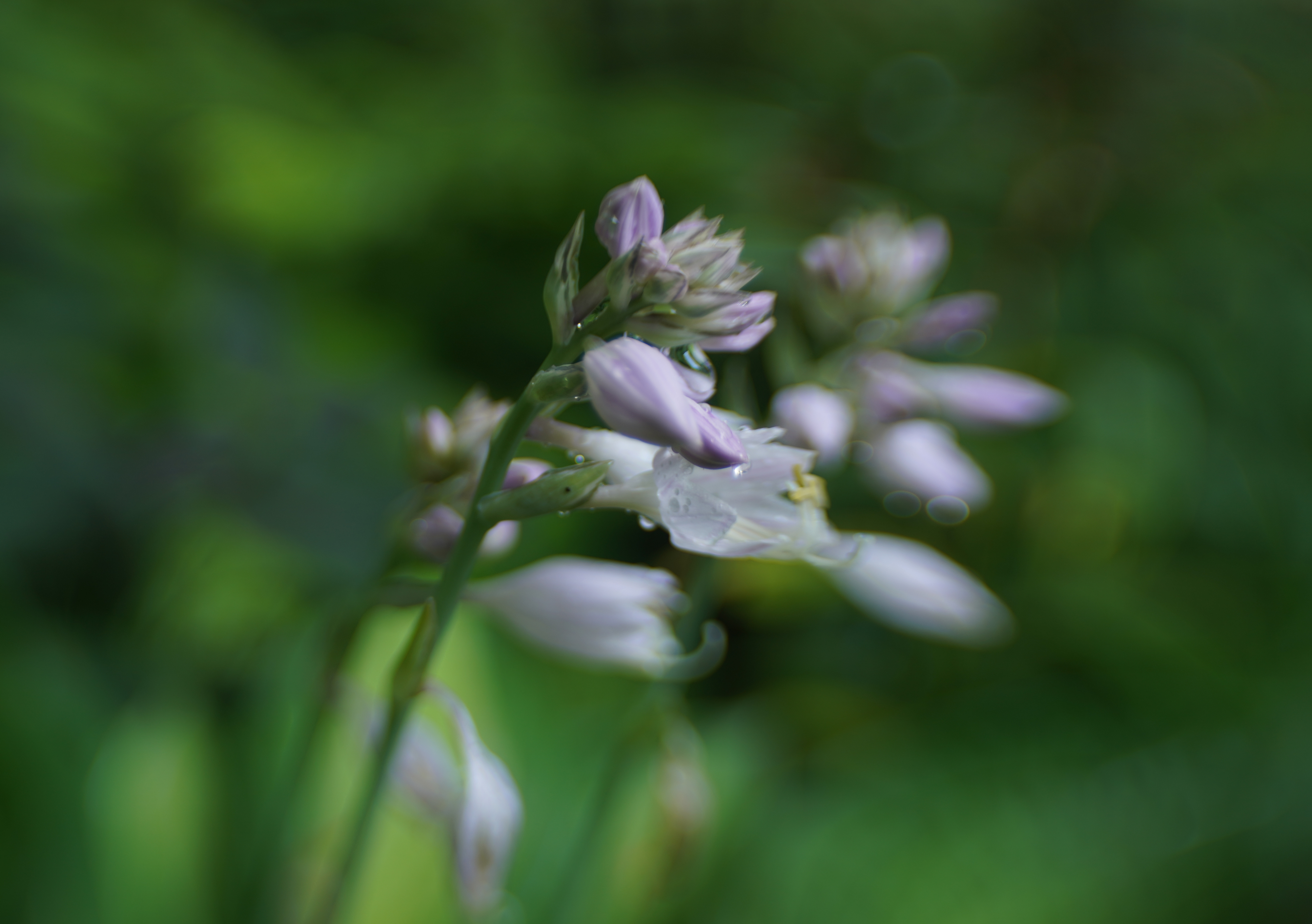 The challenge, always, with the lensbaby, is focus, and I was pleased to get the dewdrops on these hosta flowers.