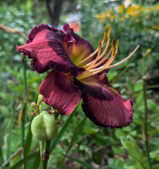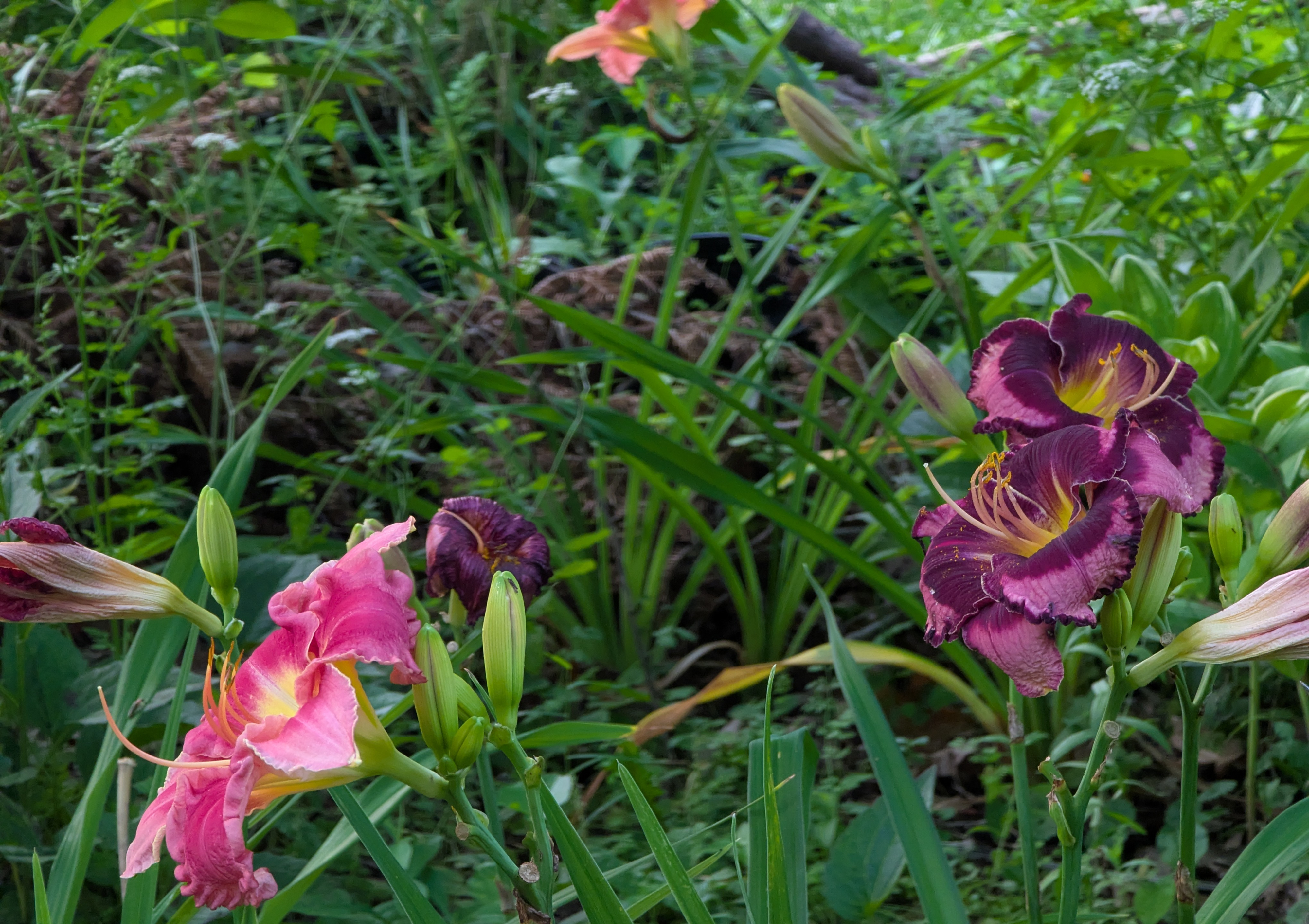 This rather oddly composed image showcases the ‘fancy’ daylily bed, which is not particularly well organized, but I do at least know these fans are not to be dug up & composted, unlike the orange species that pops up all over the garden—the pink bloom in the background, which serves to (sort of) anchor the image is also Stolen Treasure, but with afternoon light filtering thru it.
