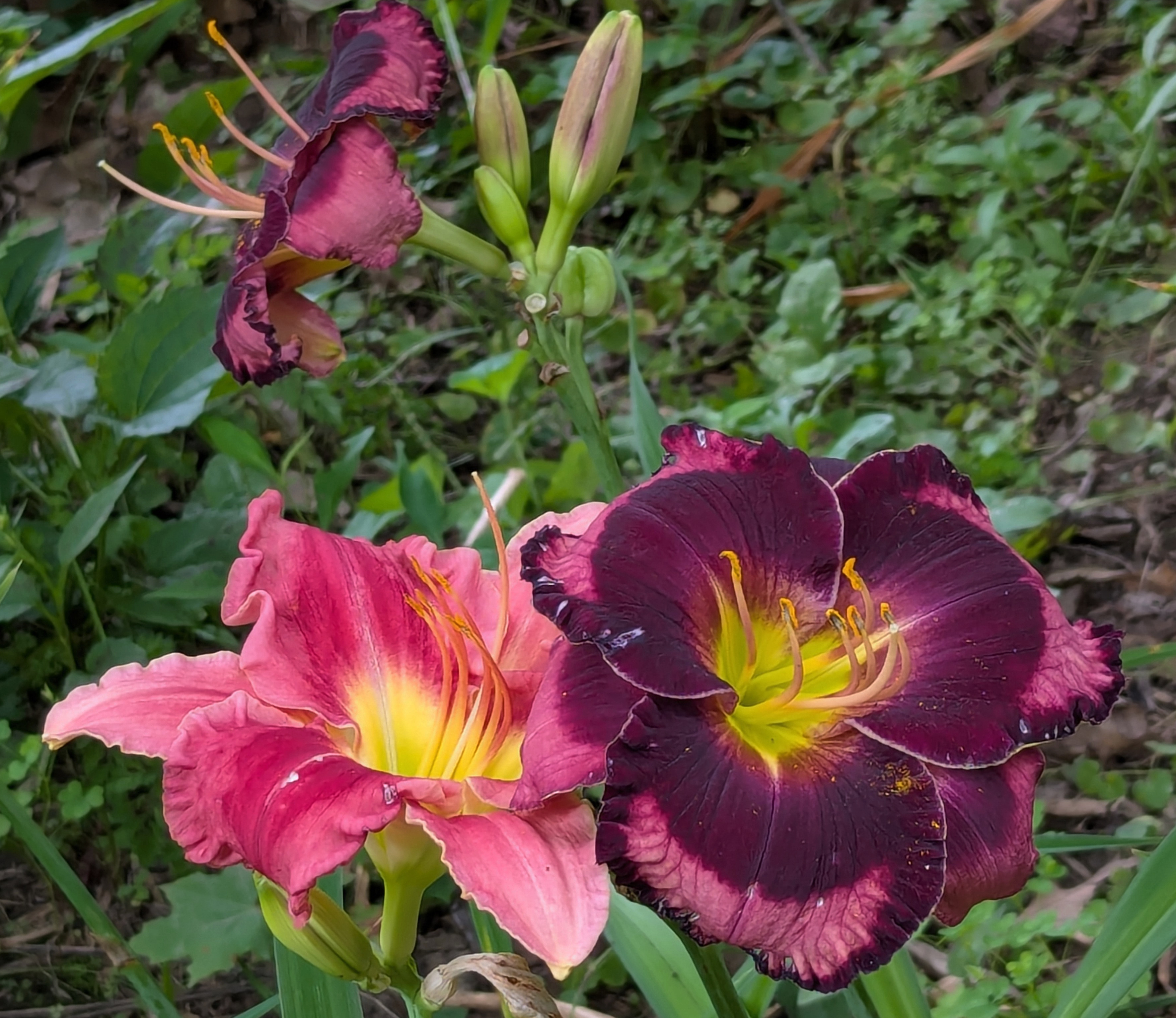 As I explained in my first page about my garden's Storm Shelter, I bought this plant in 2020, it bloomed for the first time in 2022, and now, as of 2025, I have three whole fans of this daylily cultivar–their current protected, but rather shady, location under a feral tulip tree and the high energy demands of the big blooms mean they spread rather slowly.