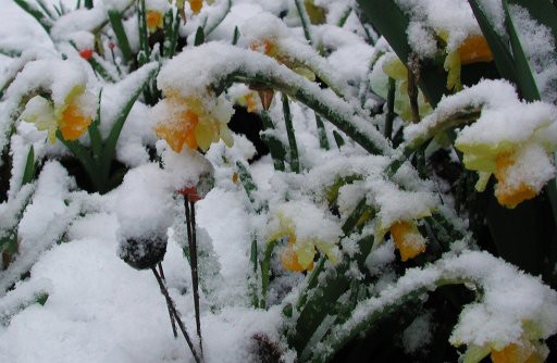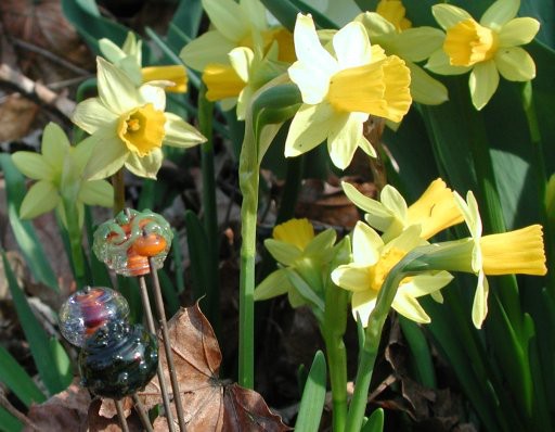 Poor daffs, bowed down with snow: the boro beads on bent mandrels are practice beads I use as plant markers in the garden.