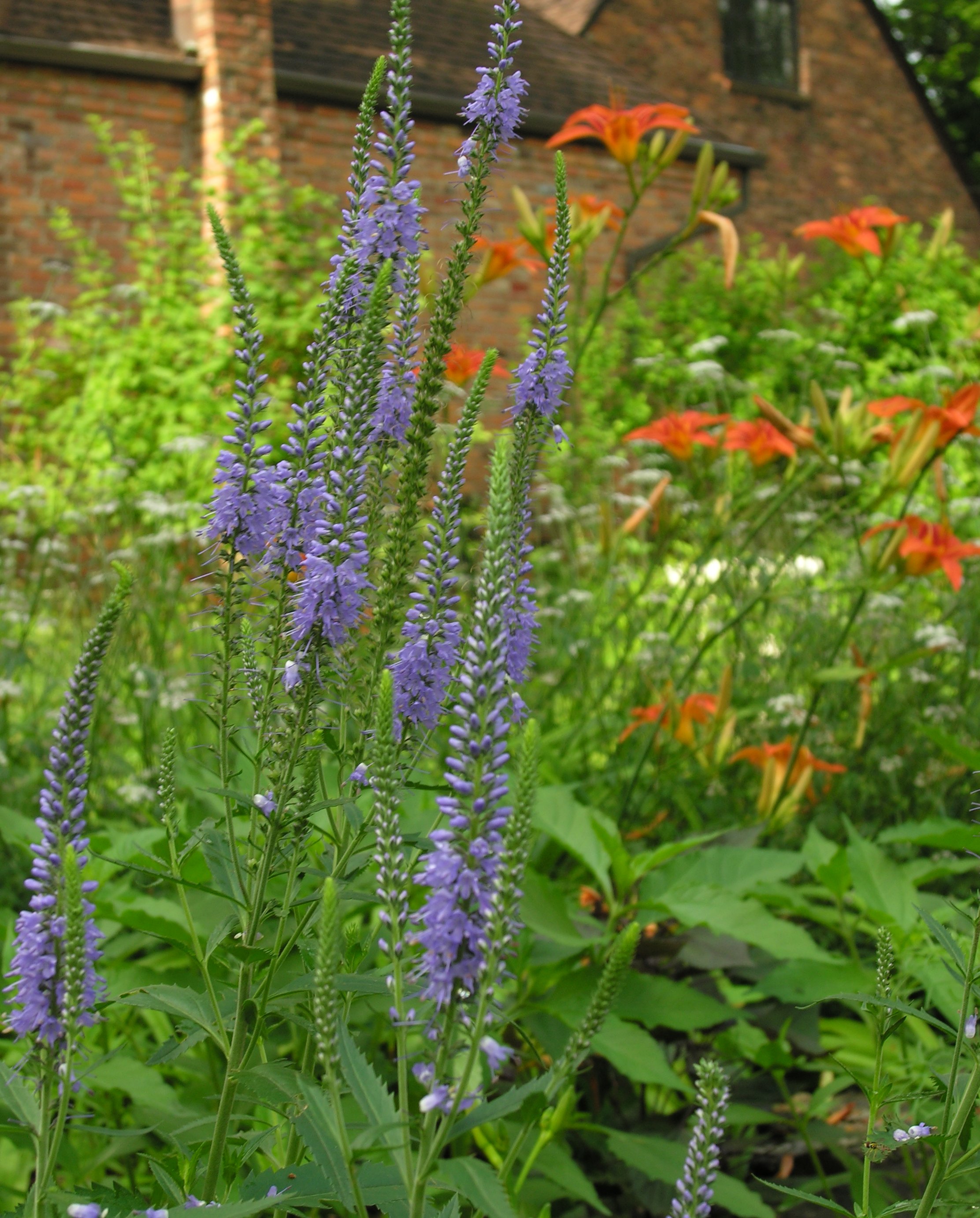 Last year I attempted to grow veronica—speedwell—from seed. This year I moved some of the plants out of the holding bed, thereby giving them more space. I still don't really have enough sun for these plants, but they have done reasonably well, and I appreciate the delicate, spiky form—a good contrast to the round shapes of the daisy like flowers that dominate my garden (cuz they're easy to grow) and the bold form of daylilies.