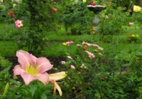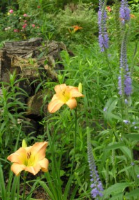 These pictures were taken 4th July, and as you see, early daylilies—the traditional orange ones, plus the large-petal pastels—pink and pale orange—are also in bloom.