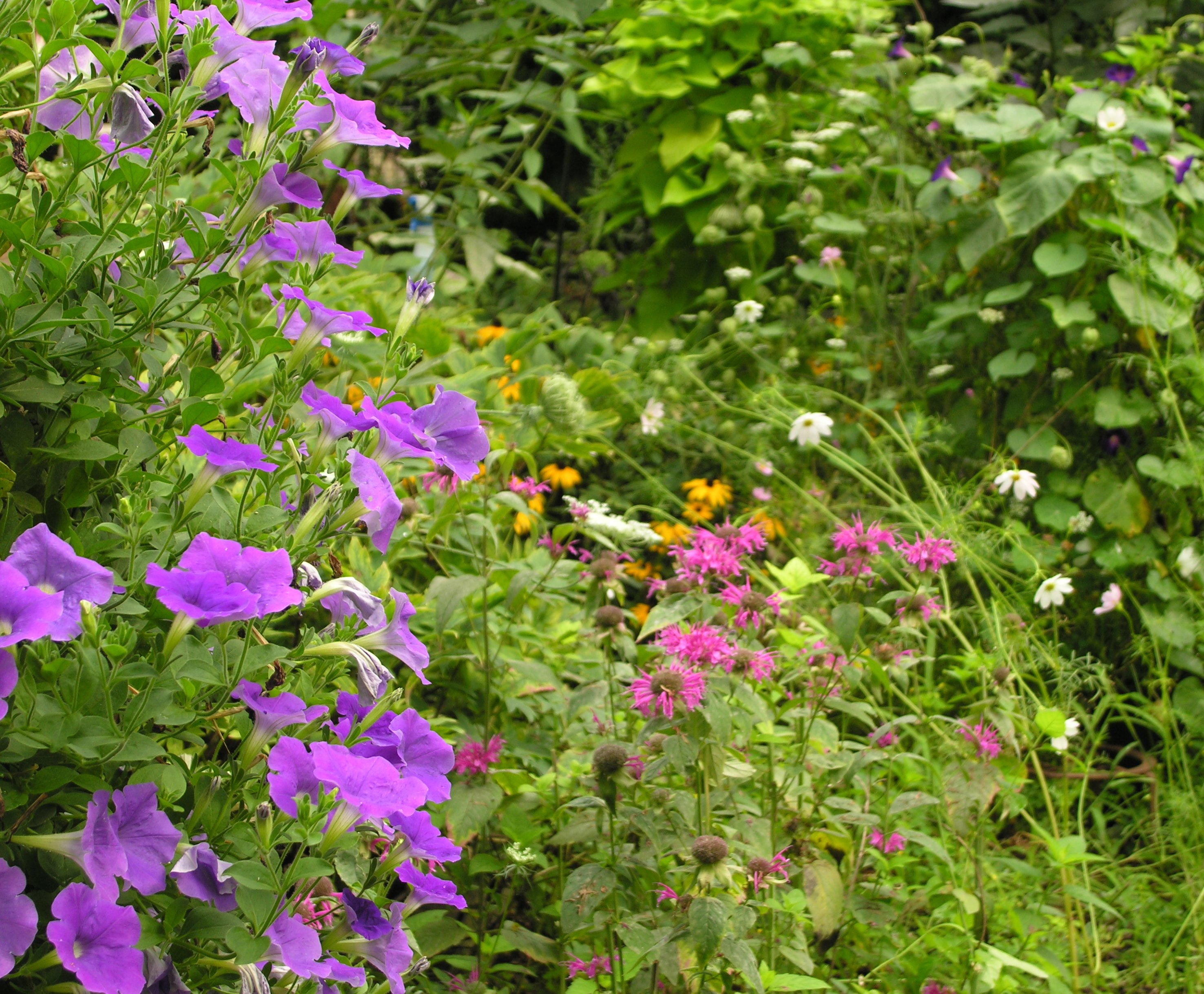 I kind of like this shot of with the side of one of my hanging baskets in the foreground. The pink monarda in the background was cut back just before Gathering, and is a 2nd flush of growth.