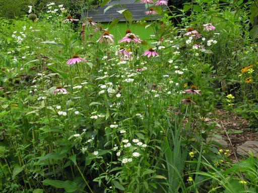 Coneflowers and daisy fleabane, with a few cosmos to the left, and mustards & black eyed susans to the right.