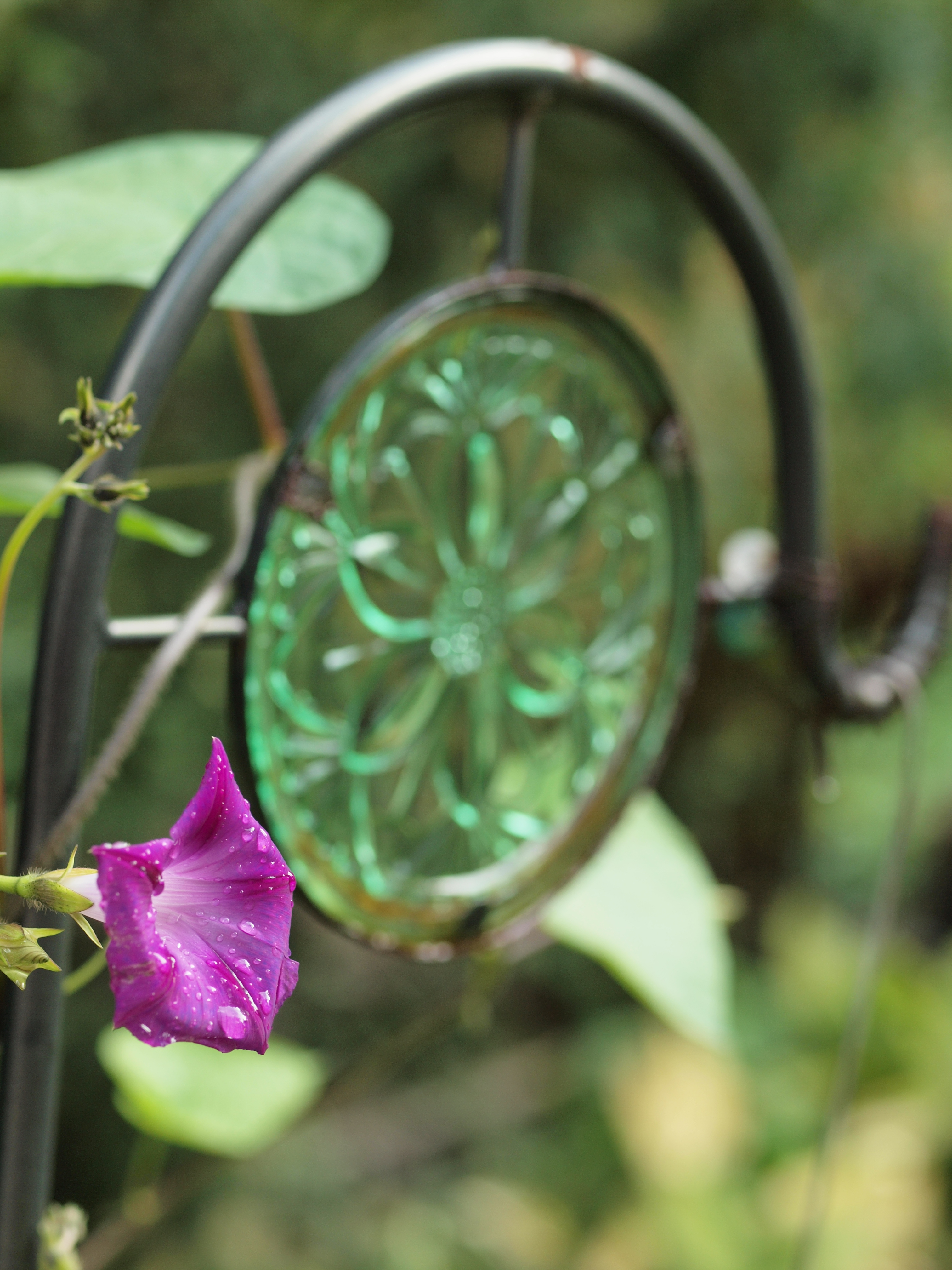 This plant hanger is actually in too much shade for a typical hanging basket, but some wild seeds from morning glories I planted...um at least three years ago managed to send up a plant. The flower is in kind of rocky shape, but I like this photo anyway.