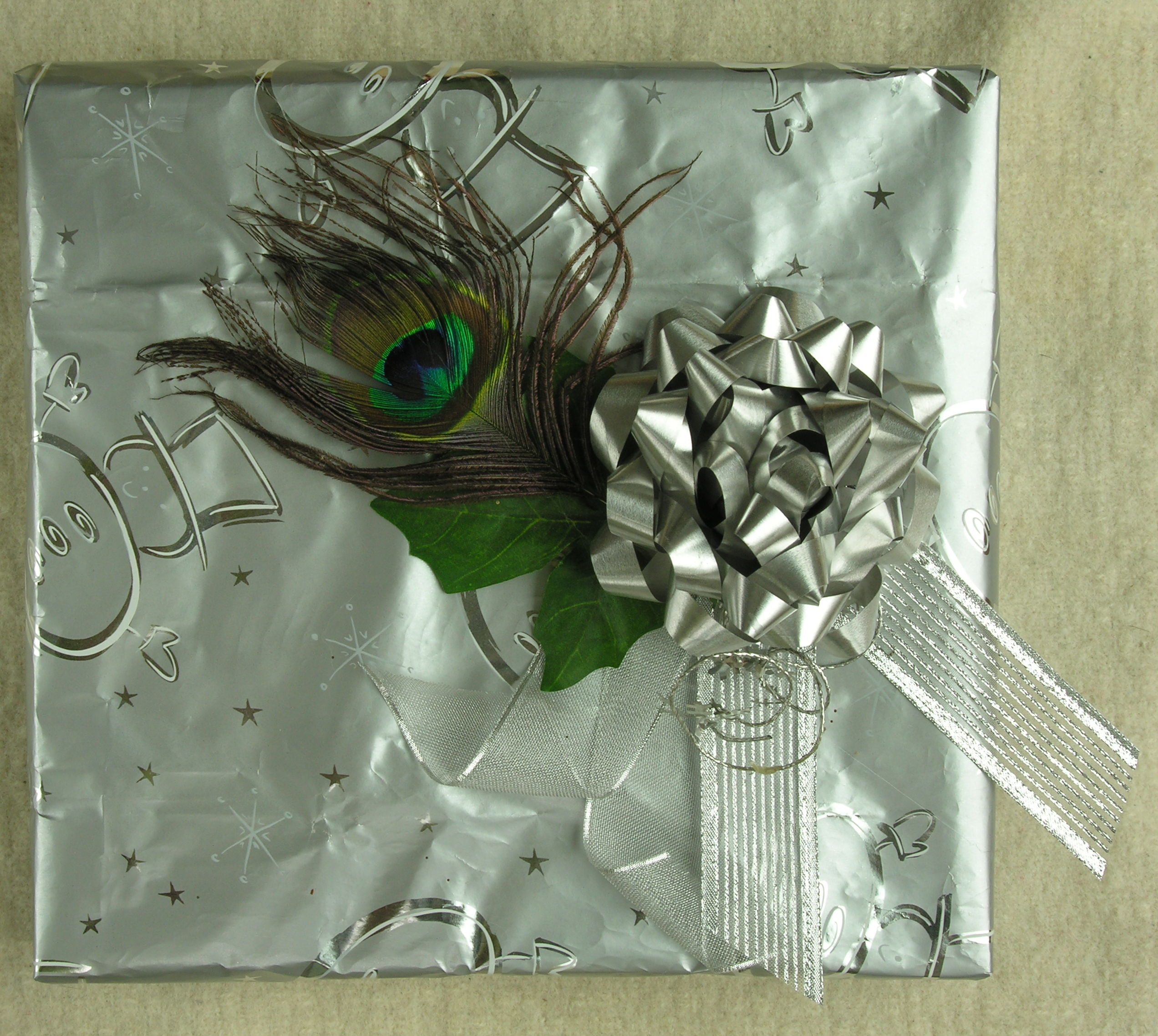 Granted, the sort organic, victorian-era peacock feather doesn't quite go with the modern paper...mebbe this gift was to me, from my friend Page? The overall spare quality suggests this, as does the layout of the ribbon and bow (sort of like a prize ribbon)—a signature design motif of hers.