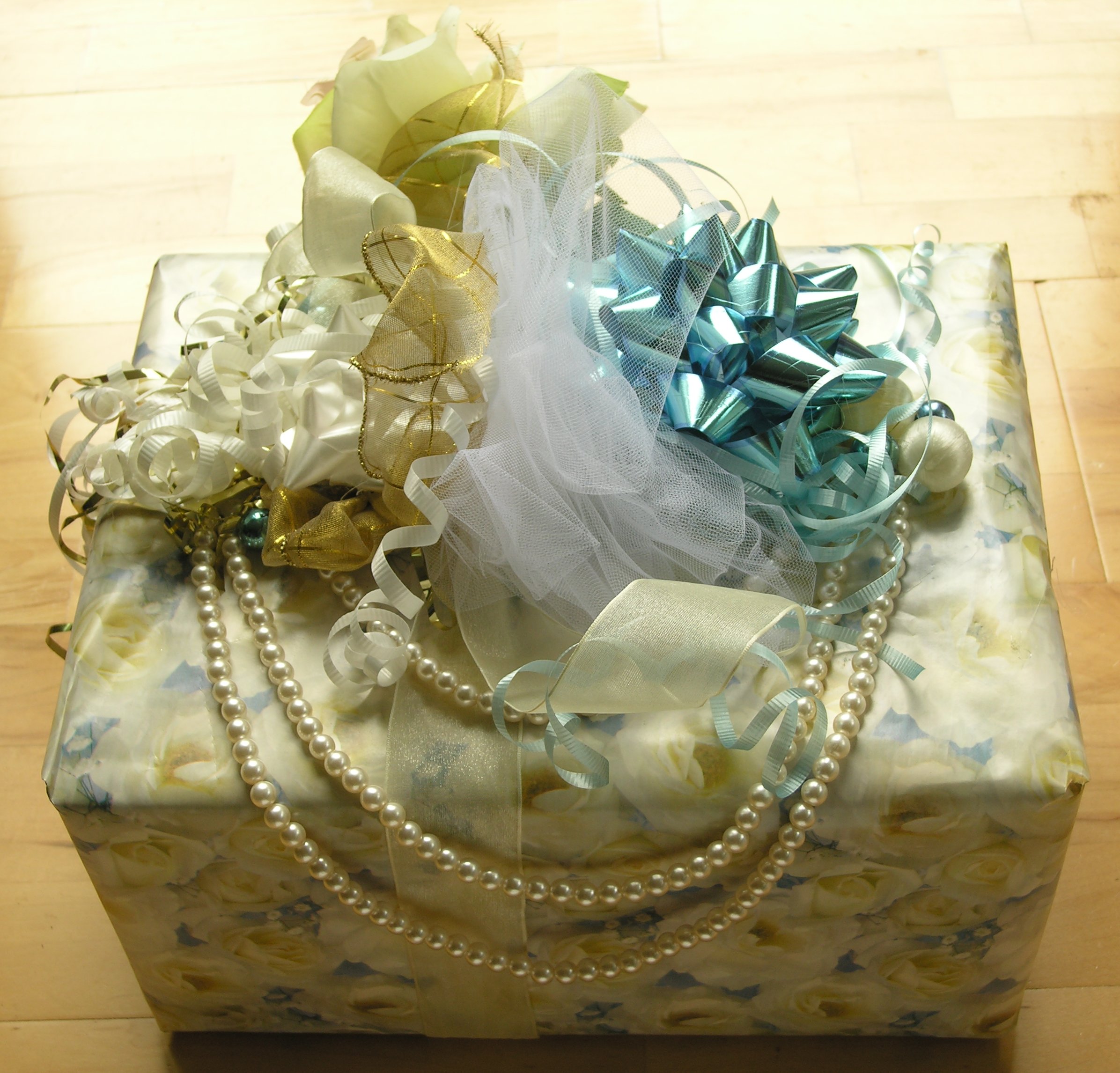box measures 12x9-1/2x7”. wrapping paper, silk rose, plastic pearls, fine tulle, ribbon, bows, old ornaments, hot glue. jun07