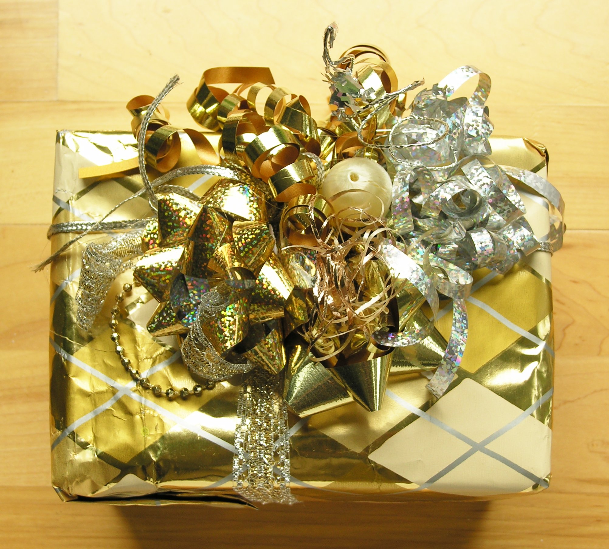 They still remain to be completely organized and filled, but I love them already. As I do the splendid collection of bows my wonderful sister in law found for me. The metallic blue one used in this gift has a very subtle edging of slightly darker blue you should be able to see if you click on the enlargement. I saw a lovely transparent box filled with really premium pink bows sitting on a shelf in her basement, and was dying to know where she got them (eek, buy new, expensive bows? Oh, how the mighty have fallen...) but she wasn't sure; but in due course these showed up with a post note “for Sylvus” when I visited and now I finally got to use one.