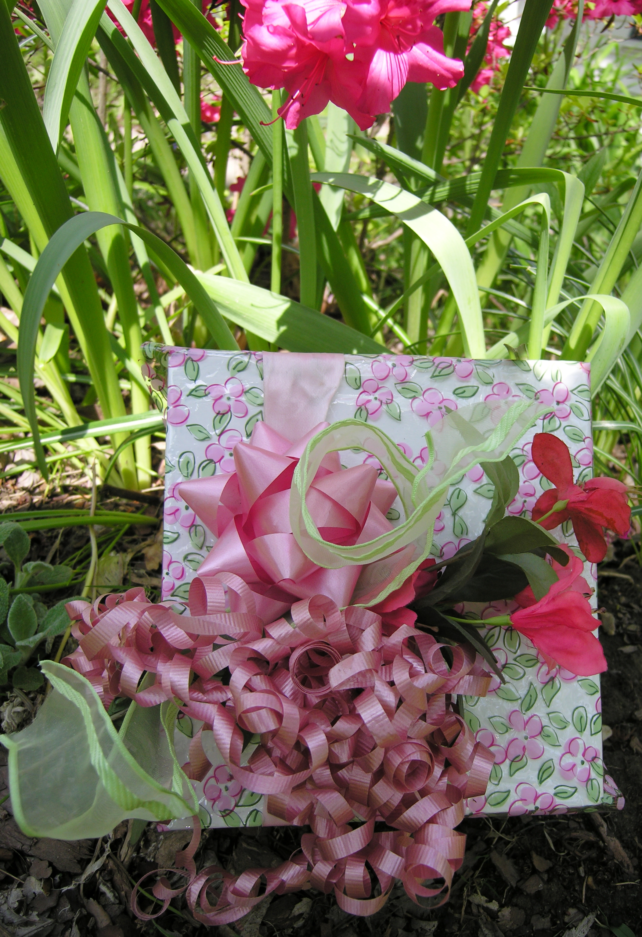 Then, since my rhododendron bush was in bloom, I photographed the gift using the matching flowers as a backdrop. The recipient liked it enough to take the box and wrappings with her, so I was very pleased.