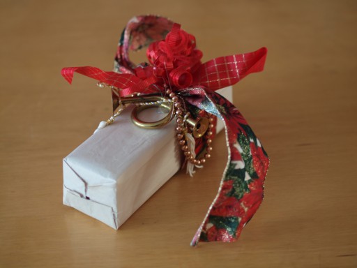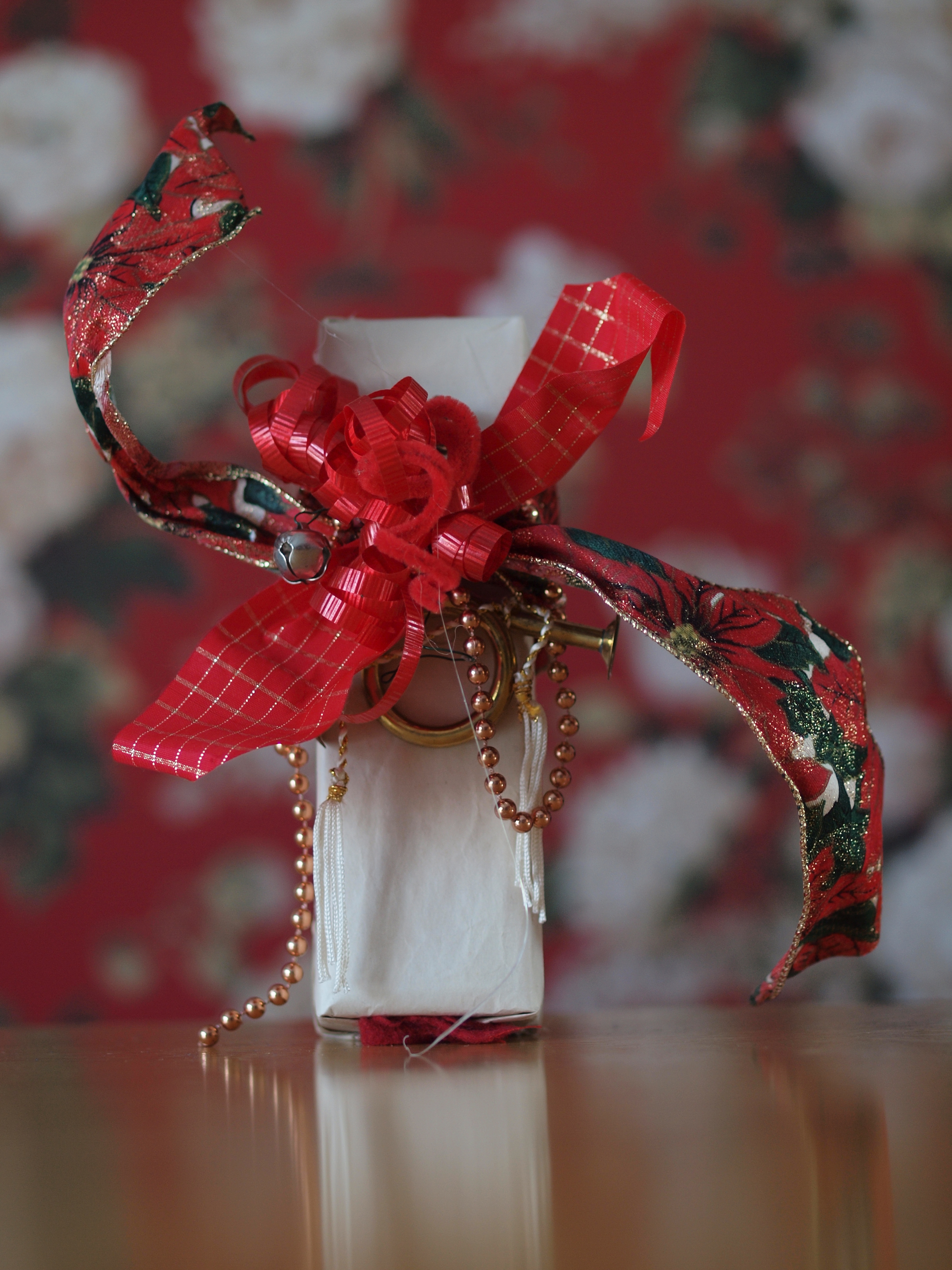 It's probably just as well the paper is so plain, given that a relatively small gift is loaded with contrasting poinsetta floral and geometric square ribbons, pinkish metallic beads, and a cute little brass horn. I suppose it's only fitting that the background is equally flamboyant wallpaper, also in reds, greens and pinks. The gift does kind of disappear into it, though