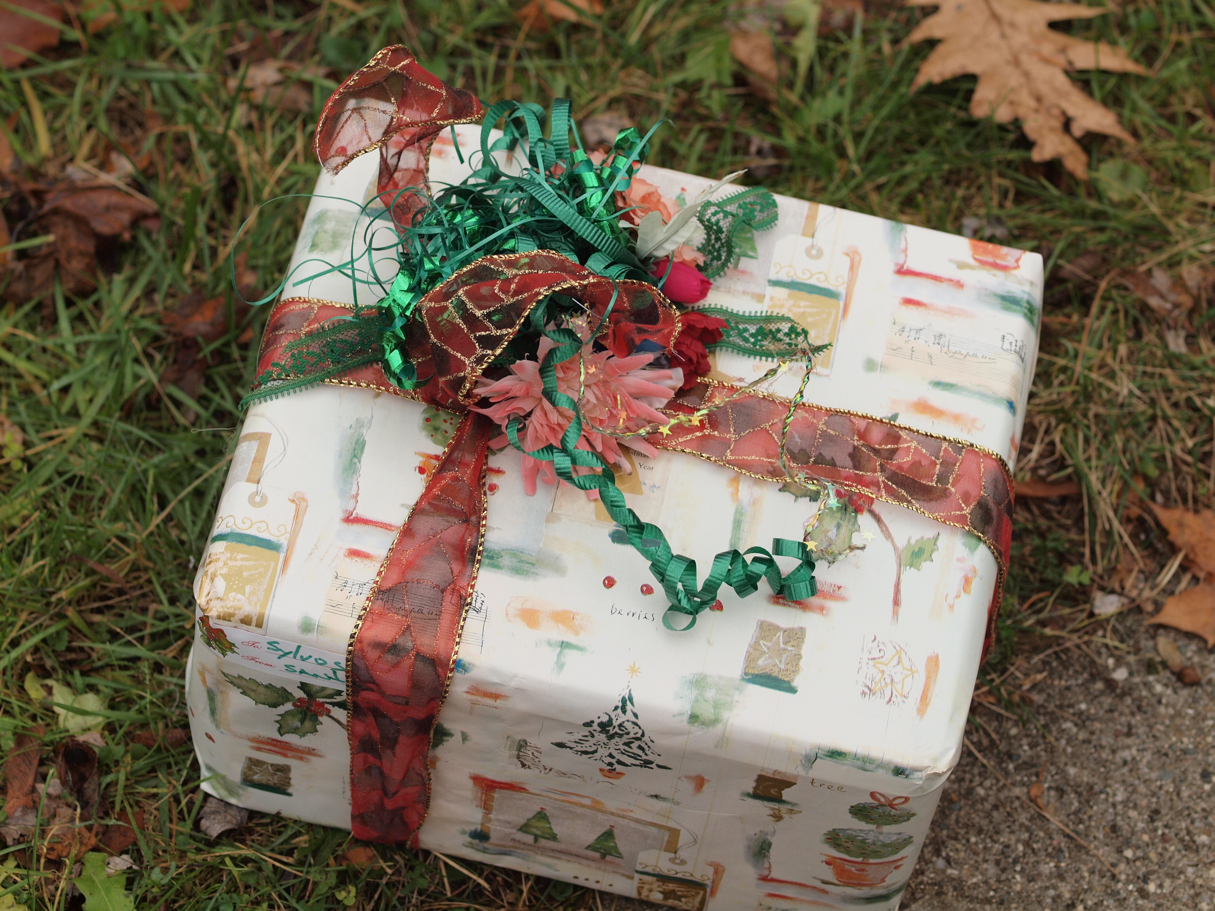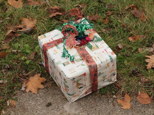 I've featured this paper before, though the gift shown was actually put together after this one, in 2012, though it retains many of the components of this one, such as the pink chrysanthemum and green ribbons (though it ditches the red ribbon in favour of a gold accent, and adds lime, always a fave:)