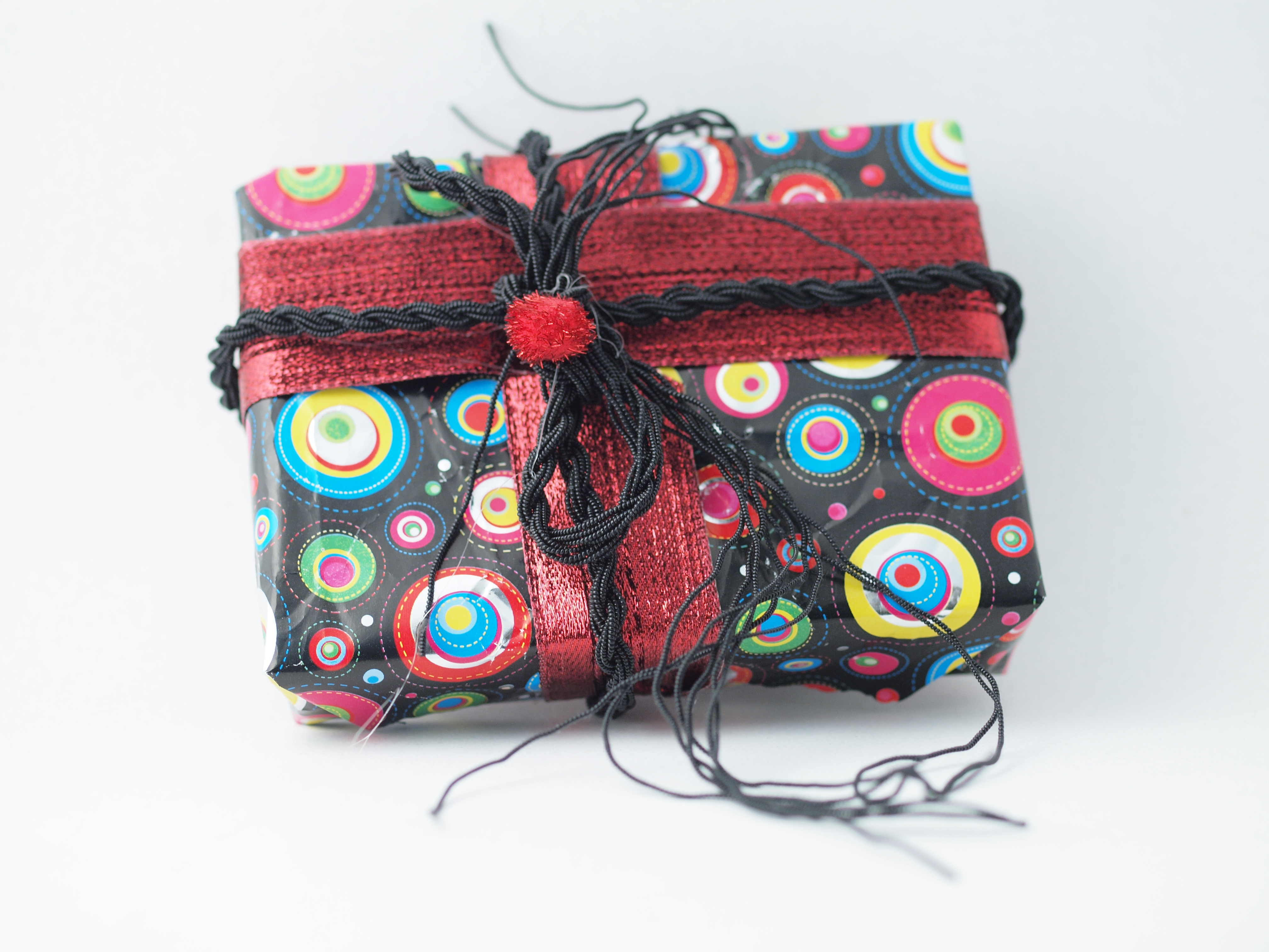 To push the sophistication (i.e. make the gift look as if it were for a grown up) I selected shiny, but textured ribbon and this black plastic ‘beaded’ cording to set off the paper. One could easily make the argument that the ribbons and paper don't quite jell, then, one could also make that same argument about the contents, so, c'est la vie.
