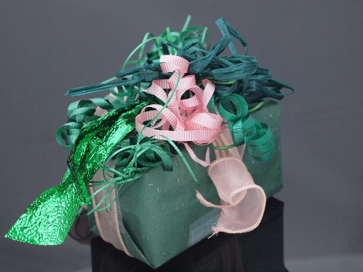 Gift wrap, photographed (& made) 5aug16. Wire-edged, raffia & plastic ribbon, paper with metallic accents. The box originally held tea, and so is roughly 2x3x5".