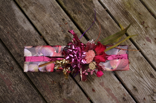 This paper—part of a collection that features the leaves and flowers in a 4-seasons theme, one design for each quarter—is stuff I've owned for years, and save for special occasions. Although wrapping a spring gift (& featuring hydrangeas, which often bloom in spring) I think this is actually meant to be the summer paper (though it seems closer to fall or even winter to me;)