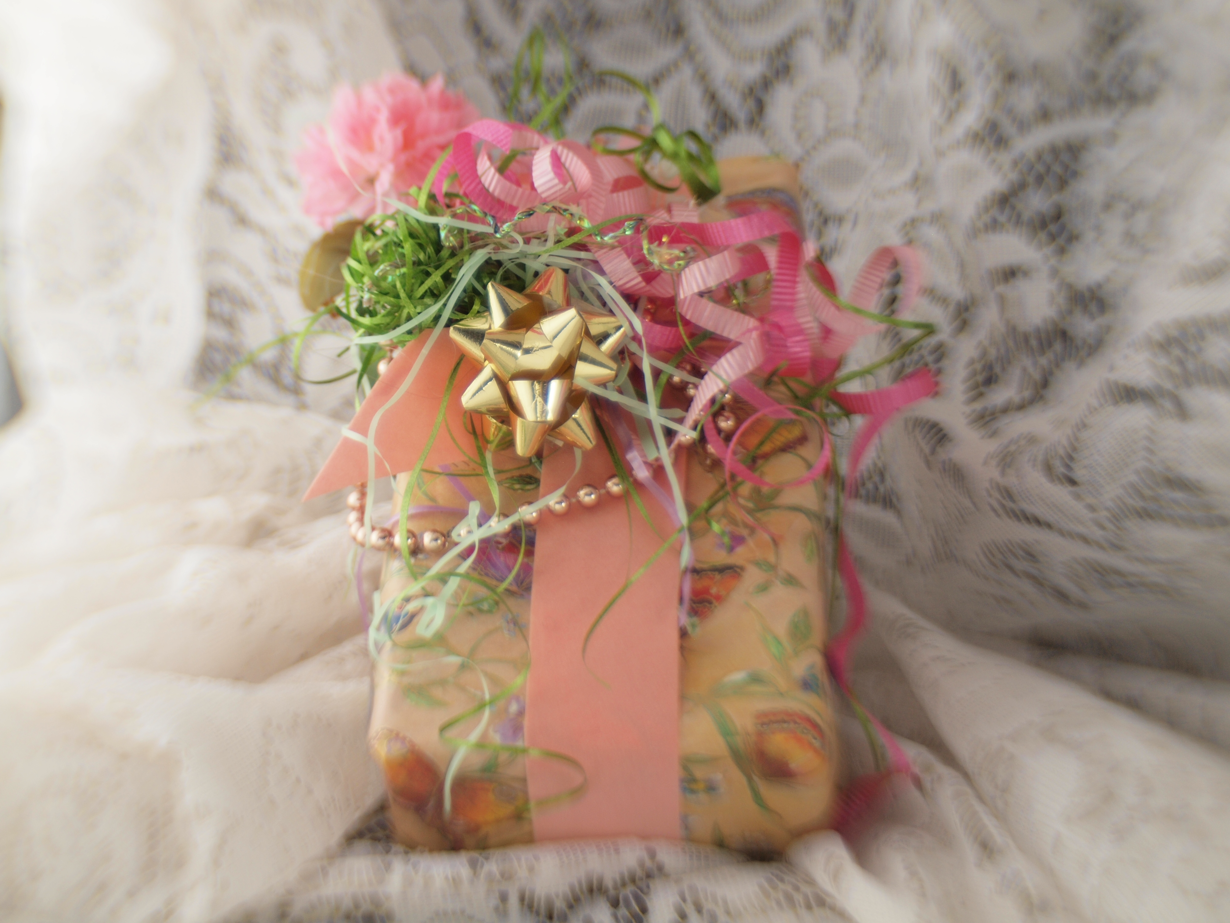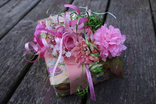 It's been awhile since I've done any serious giftwrapping, but although I took the trouble to find a nice piece of paper, I scavenged most of the decorations from stuff lying about, rather than digging deep into the huge boxes of silk flowers that should keep me supplied for the rest of my natural life. I particularly liked the way the graduated silk flower mum and pinkish metallic beads co-ordinated with the blush velvet ribbon.