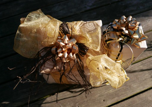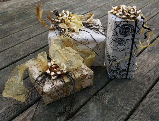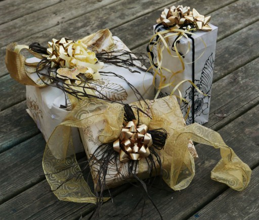 Three gifts wrapped in henna inspired brown paper; wire edged ribbon; raffia; bows; curling ribbon. Photographed 29nov2017. This image is cropped only.