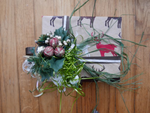 In 2015 there were several large gifts decorated with this tan paper with red, white and brown deer, which I reused two years later.[1] I really like the focal point of this giftwrap job, the thread wrapped balls: looking at the large version of the image it appears to be mixed red and silver threads, with touches of metallic green: it's very simple, but the same basic concept as the Japanese craft of temari.