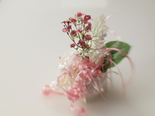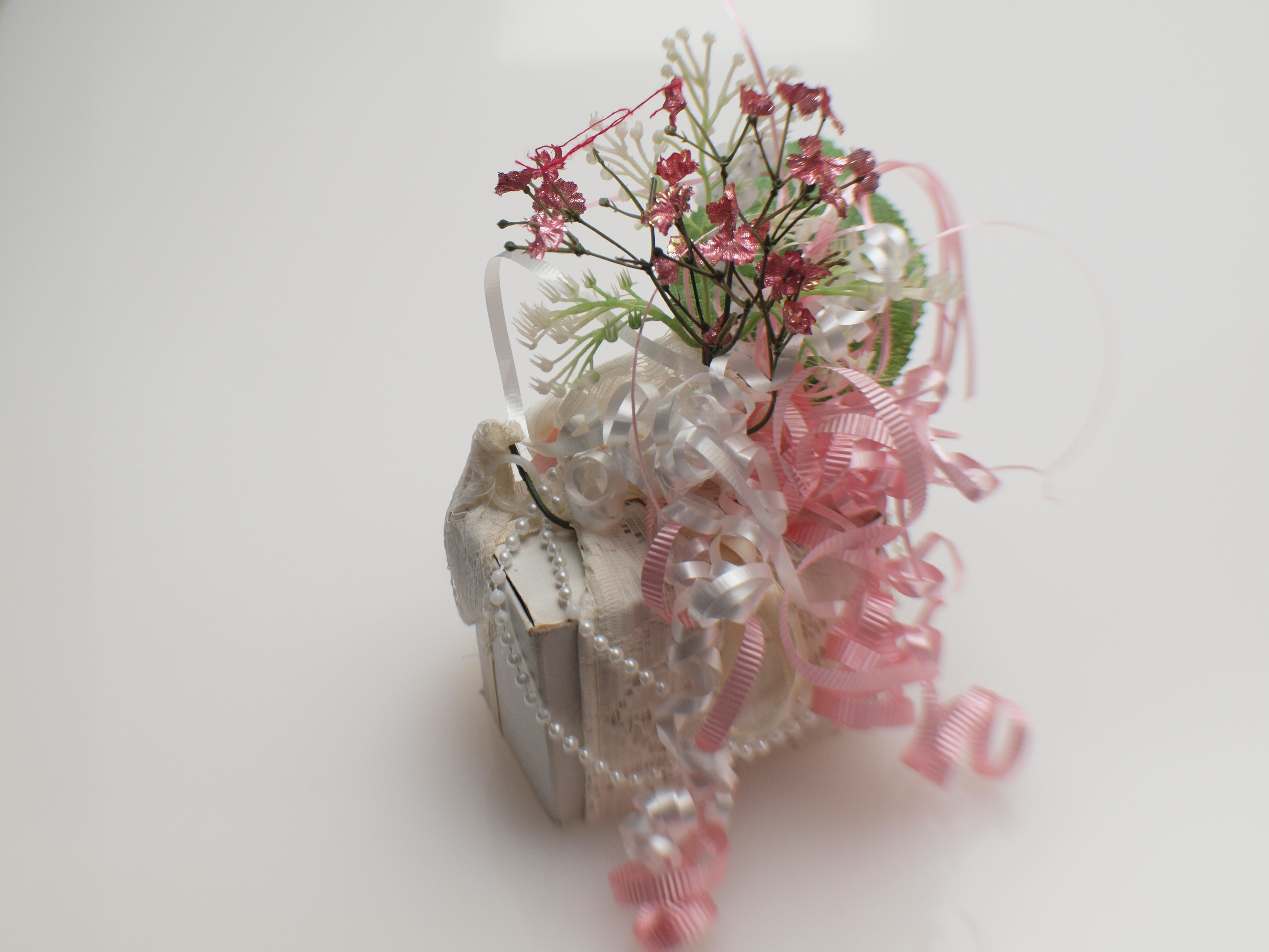 Giftwrap, 2018. Though this photo is (mis)dated 31dec2008, others in the directory were dated 5mar2018, giving an approximate creation date. Silk & plastic flowers, curling ribbon, plastic beads, synthetic lace—part of a curtain tie-back, I think. The red thread caught in the flowers is a ‘mistake’.