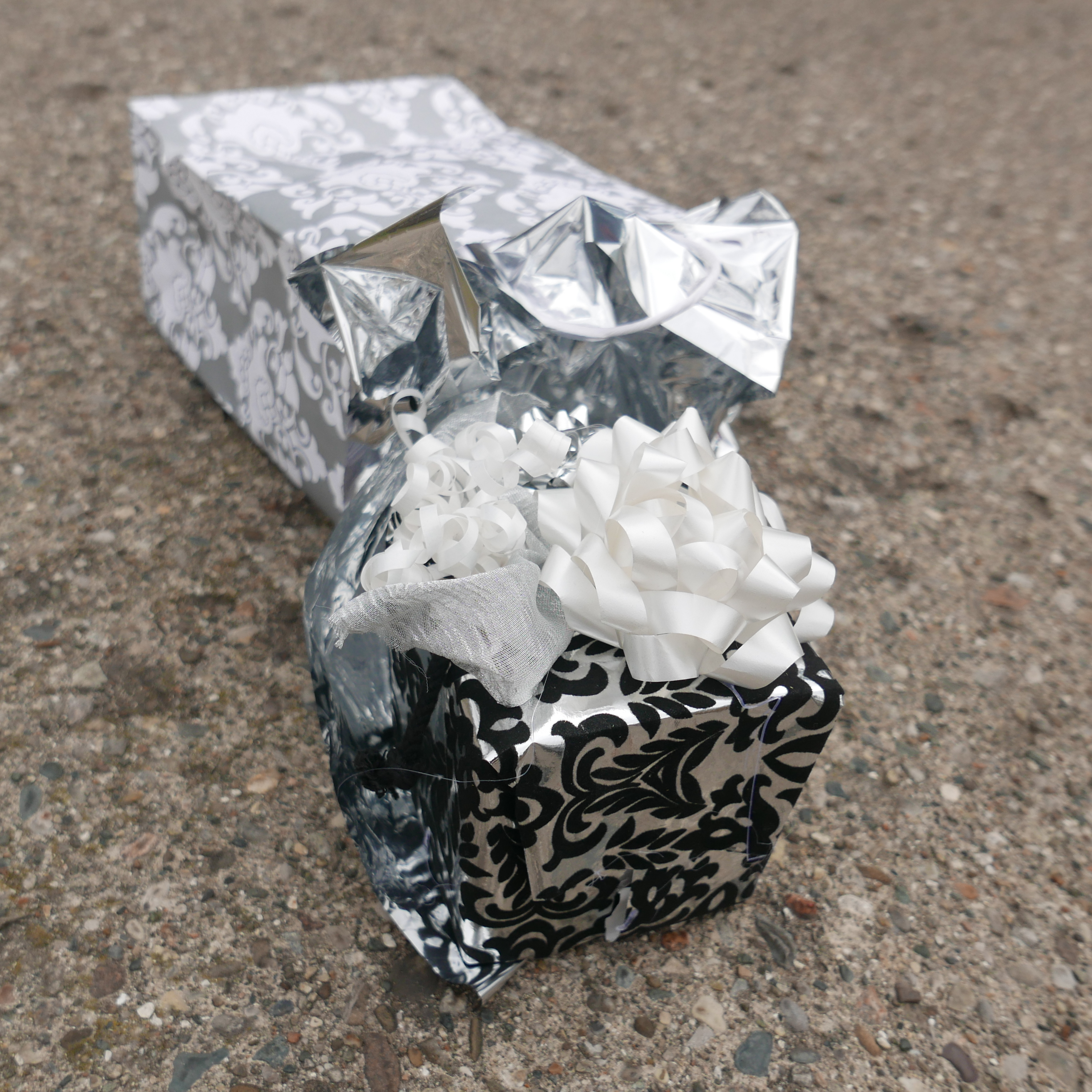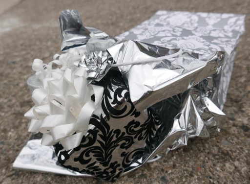 Not sure I why I never got around for featuring this elegantly wrapped gift by Page from 2018, but I'm happy to present it now: as the styling makes clear, I was very tickled by the idea of a Victorian style pattern of black flocking on silver being enclosed in a bag with white Victorian style patterns on silver.