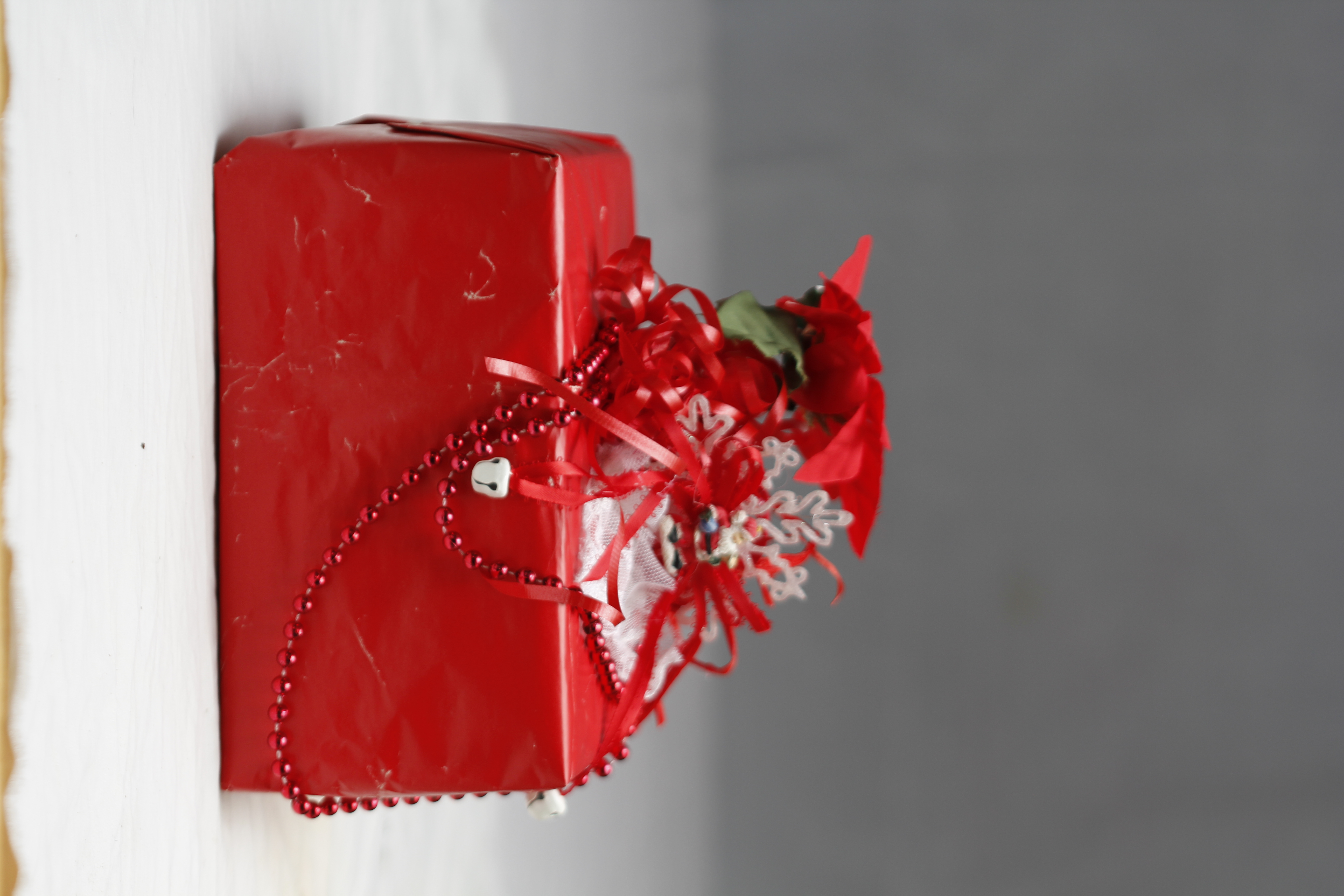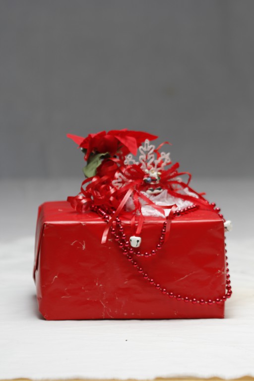 2018 red giftwrap—silk poinsettia flower, beads, jingle bell, snowflake, santa, curling ribbon, lace. Sorry about the soft focus.[1]