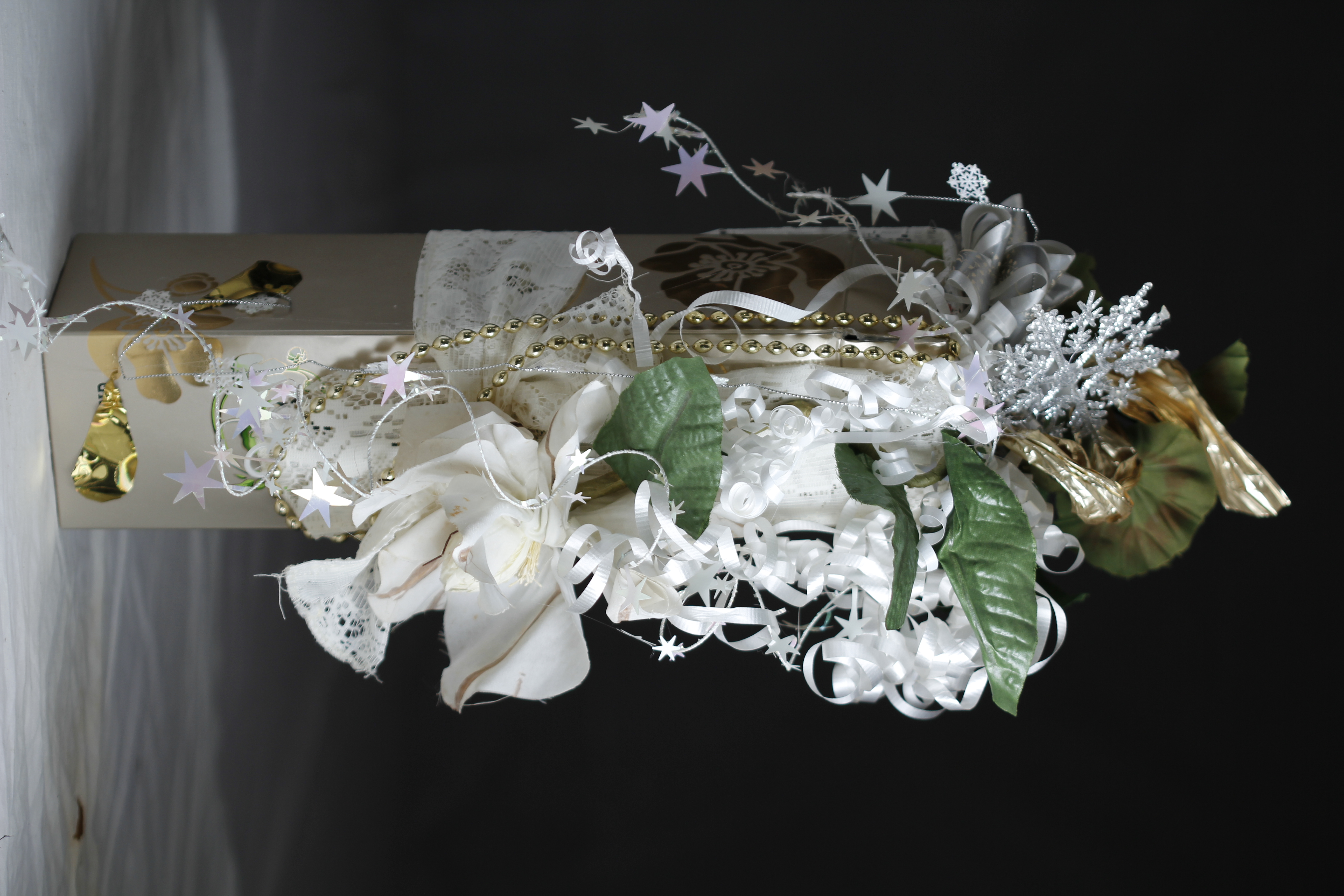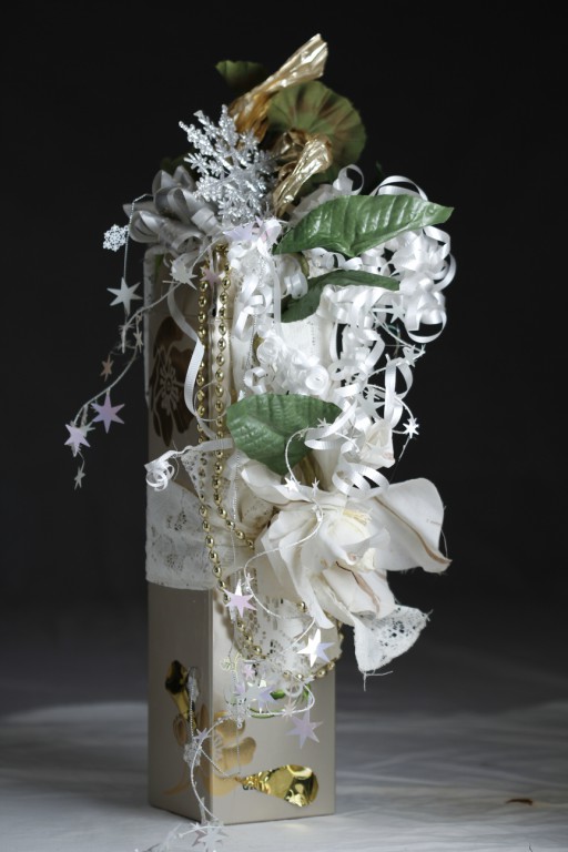 tall, white gift with star garlanding, silver snowflake, magnolia silk flower, fabric, twisted, & curling ribbons. December 2018