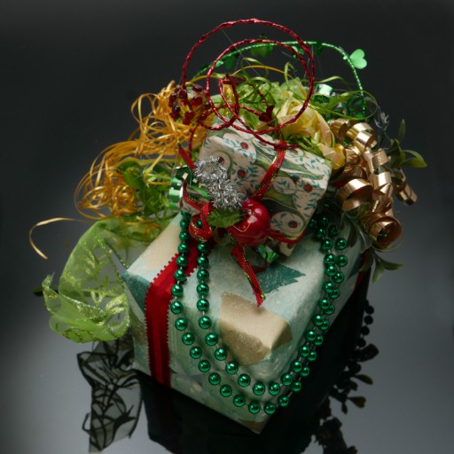 Giftwrap, made and photographed 07dec21. Fabric and mylar ribbon, boxes, paper, apple, silver pipecleaner, mylar covered wire, strands of beads (of course)... lumix LX100, lumopro manual flash, half power. Can you spot the covid bead?