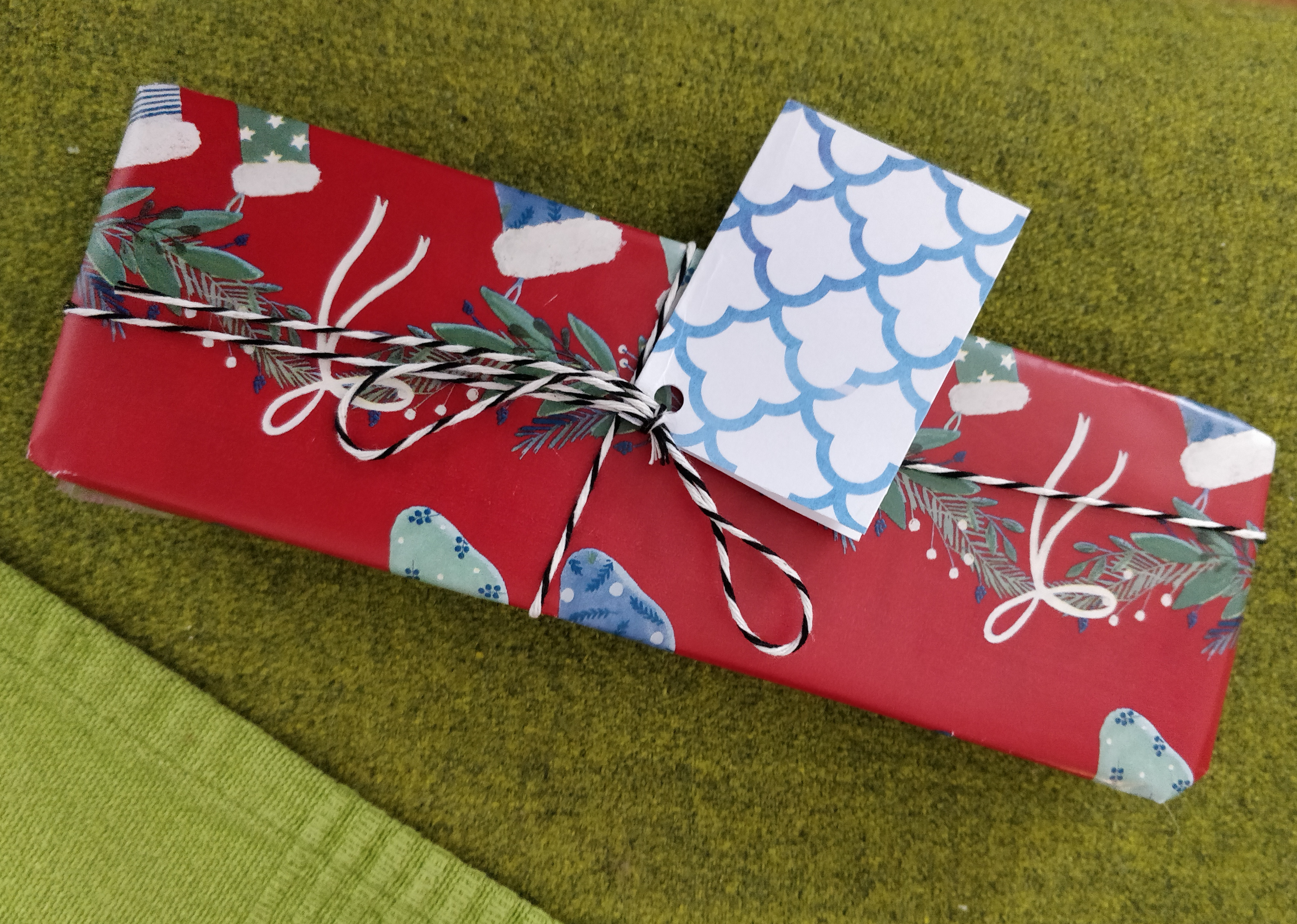 I took advantage of our sofa's contrasting acid green to pop the reds, and carefully saved the wrapping, especially the string, for future use in mixed media.