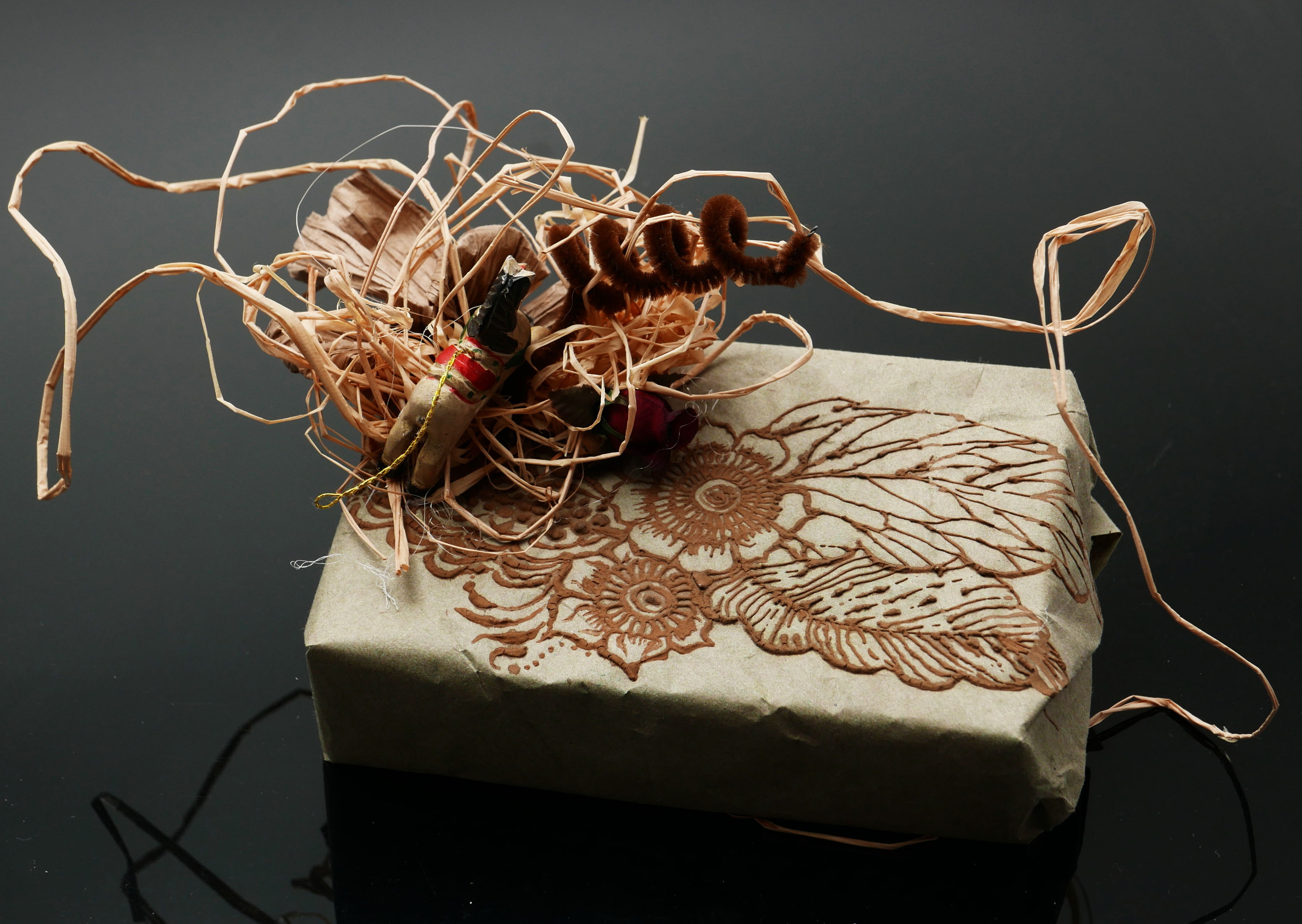 Henna decorated packing paper; raffia; pipe cleaner; horse xmas ornament; photographed 22jan21, cropped, image edited with value curves & softlight mode.