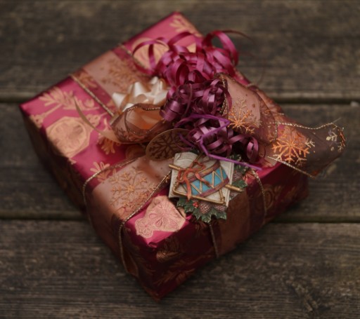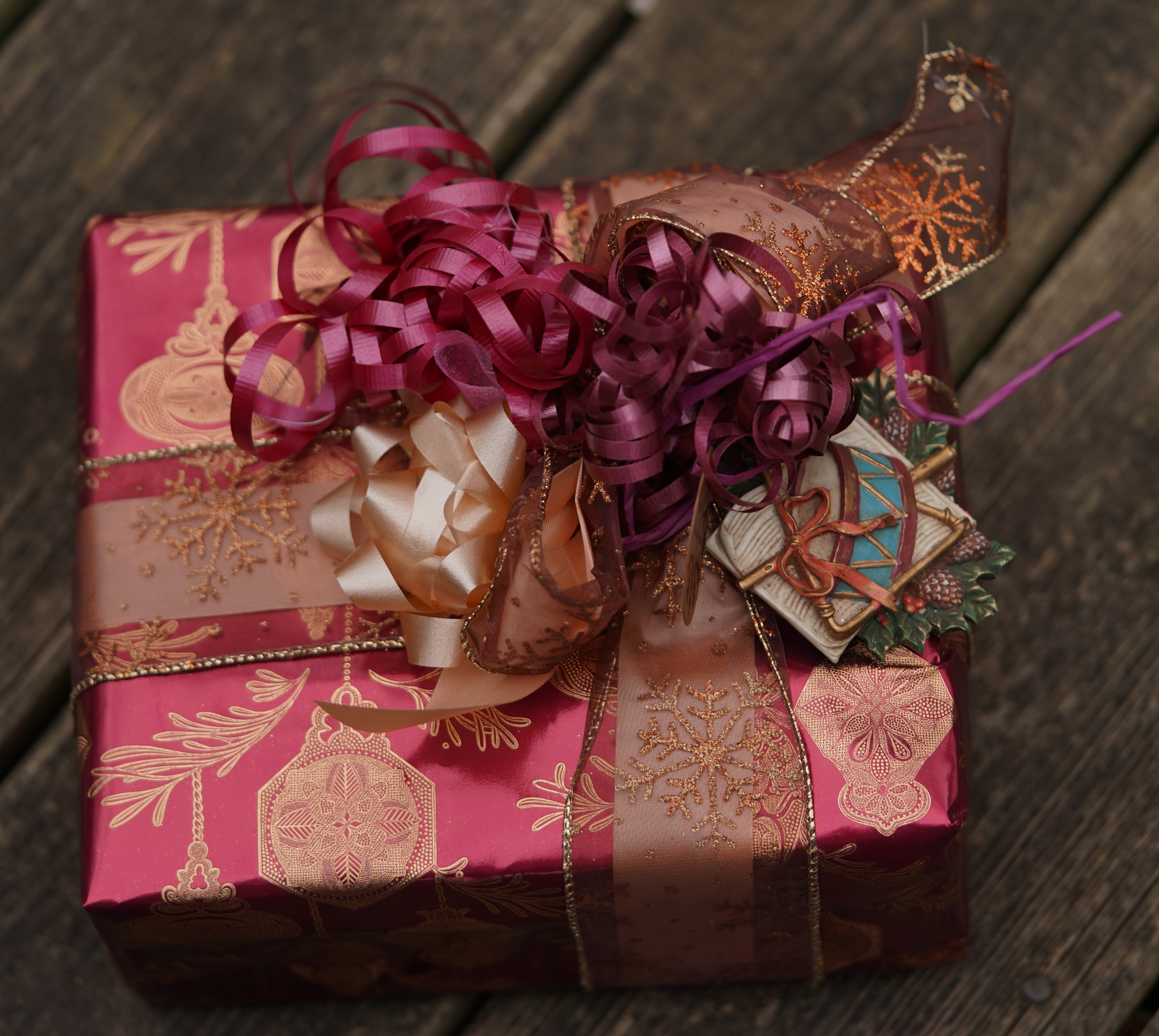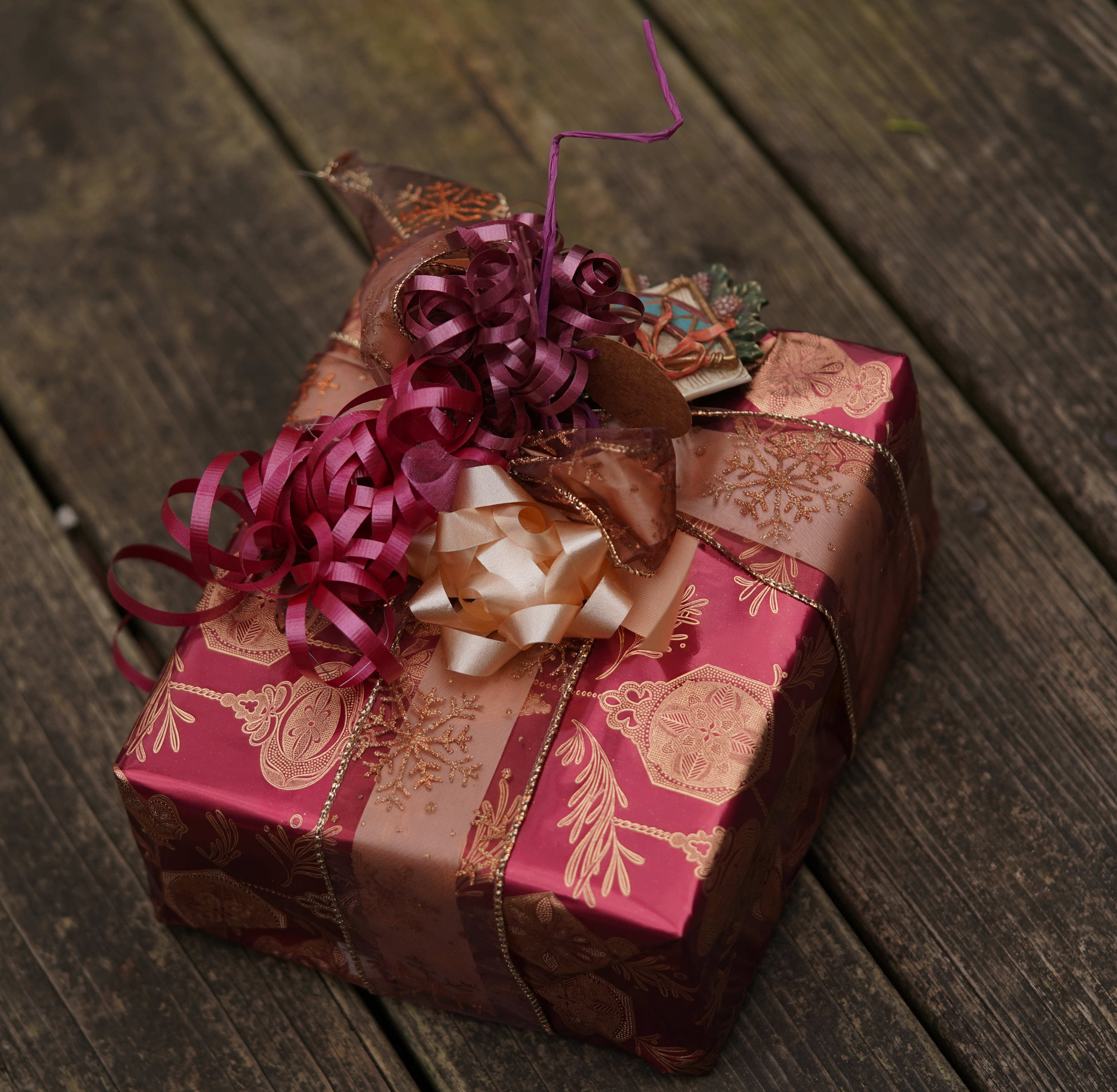 Gift decoration, old-gold foil on burgundy paper; wire edged, curling, synthetic and raffia ribbon; ornament; bows; hot glue; wrapped, photographed 21dec23, sony ILCE-7C, sony 90mm macro, f/2.8, ev -0.3,1/100s, ISO 200, WB: cloudy
