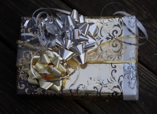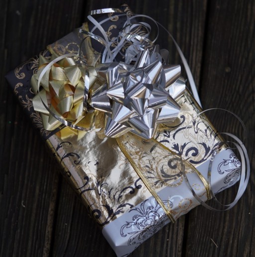 I found two bows, one silver and one gold with slightly different textures, which along with glittered transparent gold wire edged ribbon and silver curling ribbon made for a very quick, effective job—which, since I was in a tearing hurry, I really appreciated!