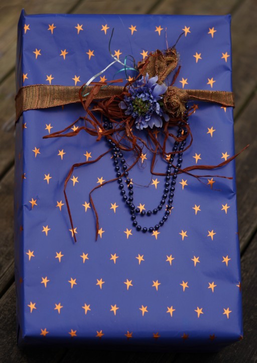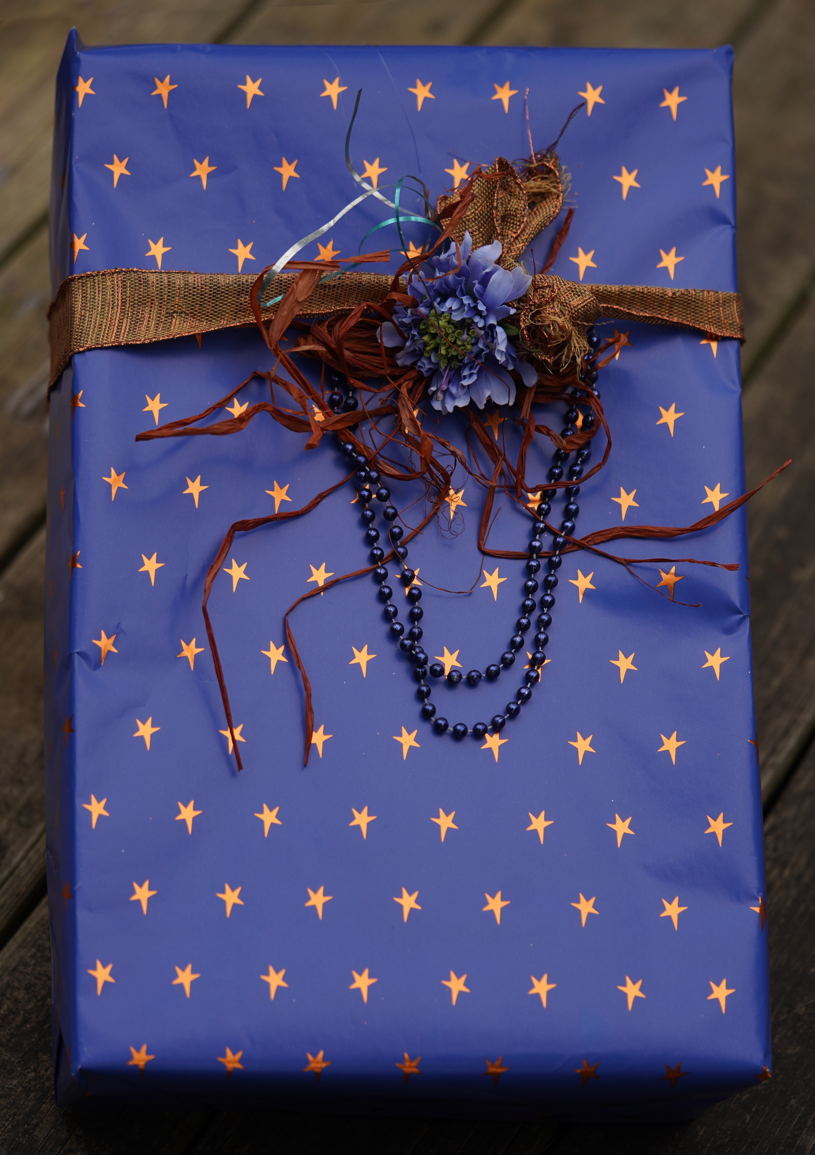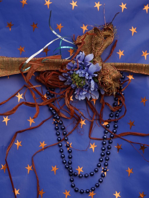 Blue wrapping paper with bronze stars; plastic bead strand, silk flower, wire edged, raffia, and mylar ribbon; sony ILCE-7C with 90mm sony macro lens, f/2.8, ev +0.3, 1/100s, ISO 160, WB: cloudy; gimp unified transform tool and some futzing around with the background to square things up a bit.