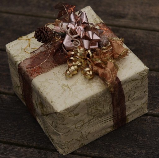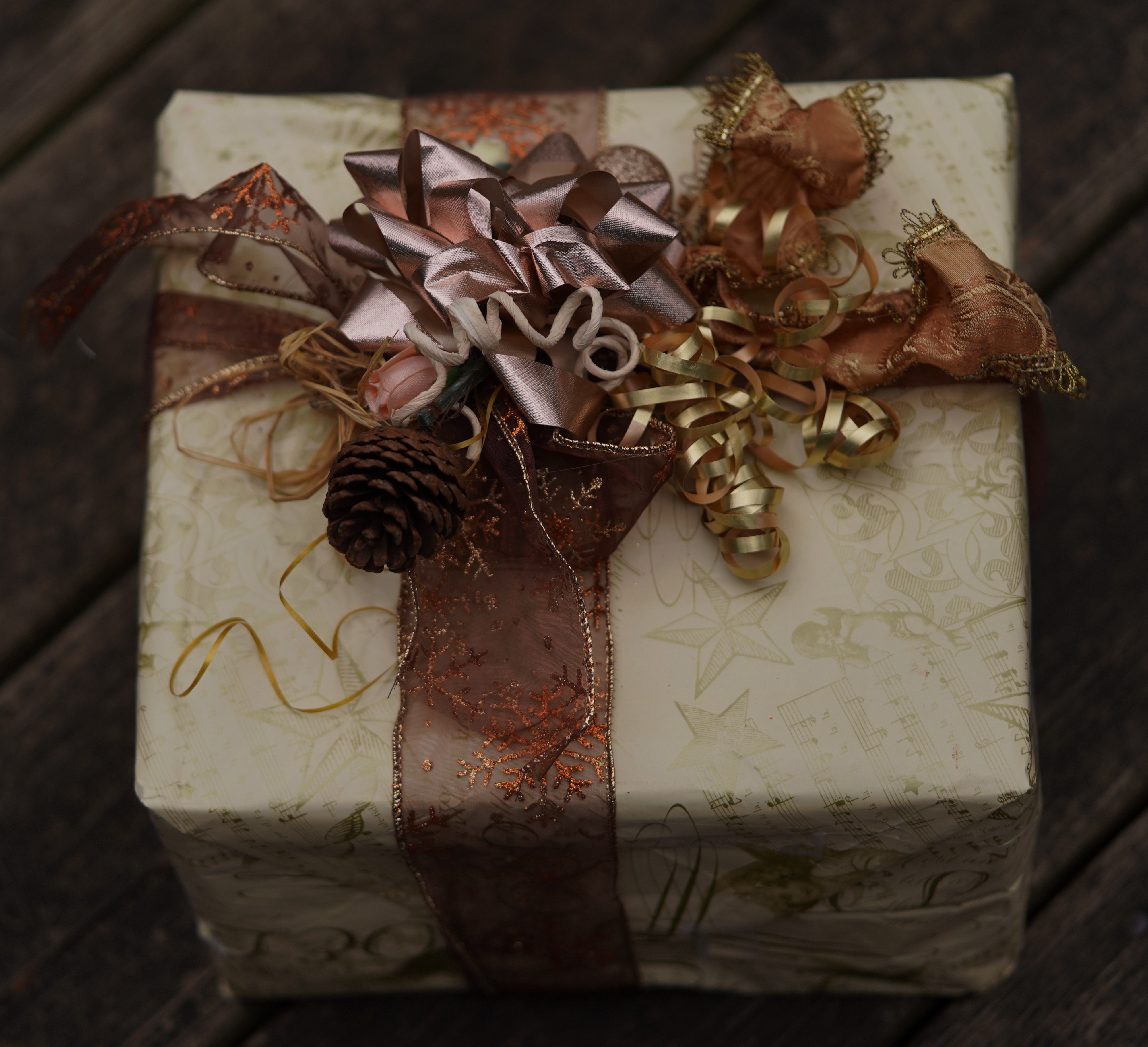 Giftwrap, approx 9.25 x 9.75 x 6.25"; 2 kinds wire edged ribbon, metallic curling, twisted paper, and raffia ribbons, metallic fabric bow, silk rosebud, pine cone, ornament, hot glue on a box that measures 7 x 6.25 x 3.5";; photographed 21dec23 sony ILCE-7C, sony 90mm macro; f/2.8, ev -0.3, 1/100s, WB: cloudy; darkened, cropped in gimp