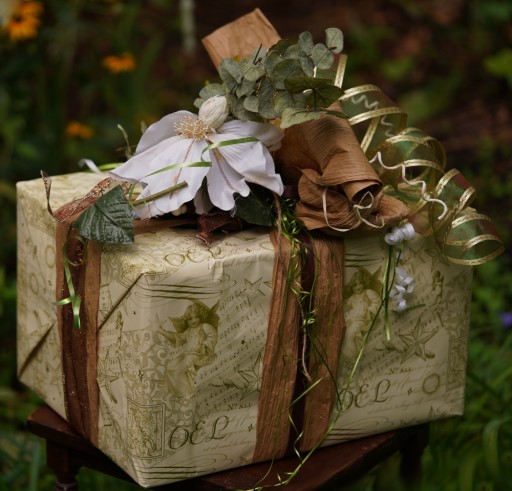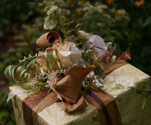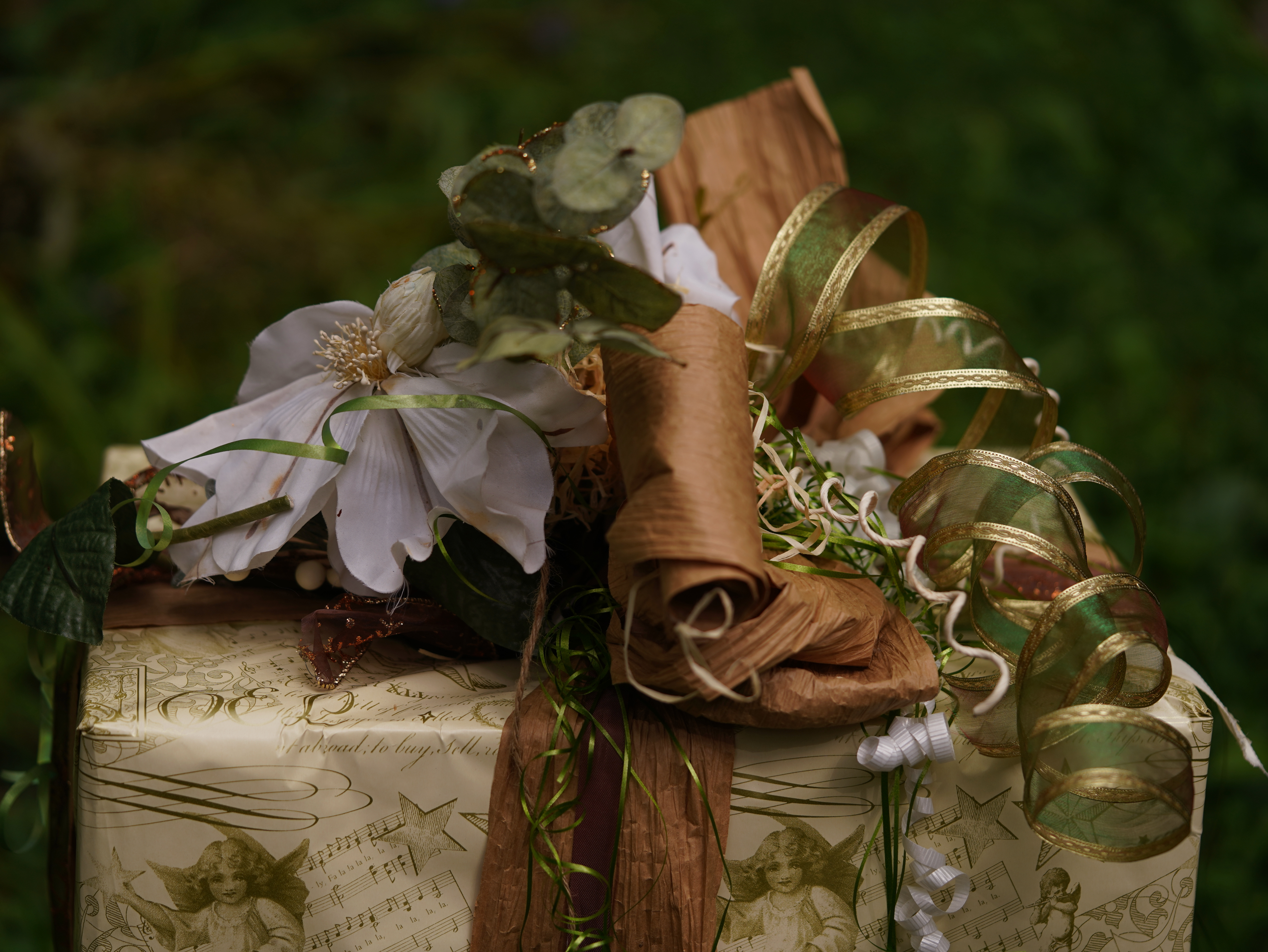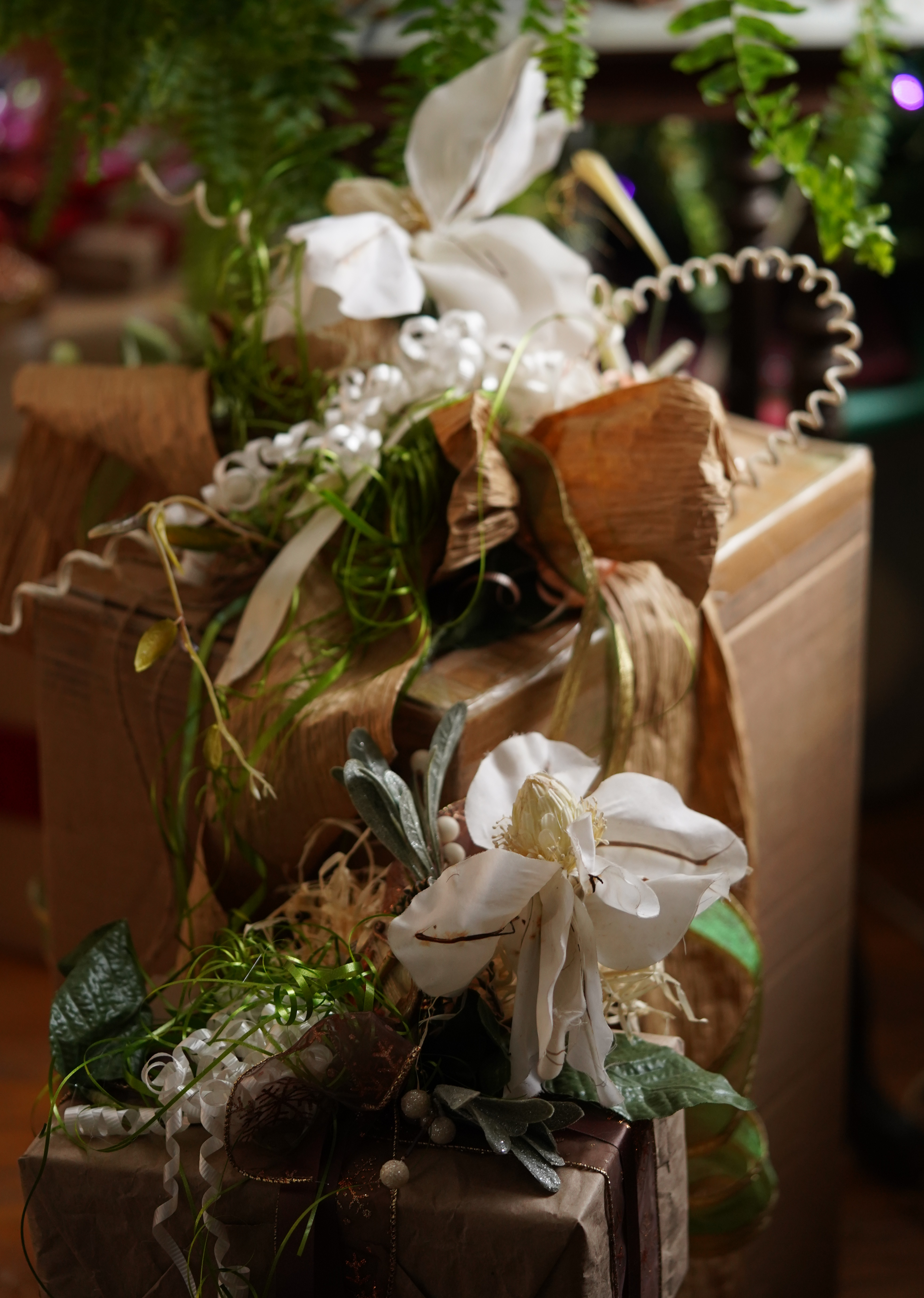 gift wrapping with silk flowers, paper, acetate?, wire edged & curling ribbons, musically themed ornament, hot glue, 24 or 25dec; photography, 25dec22 sony ILCE-7C, sony macro 90mm, f/2.8, ev +0.7 1/100s, ISO 1250, WB: cloudy; light source (natural through window); rotated, cropped and scaled in gimp