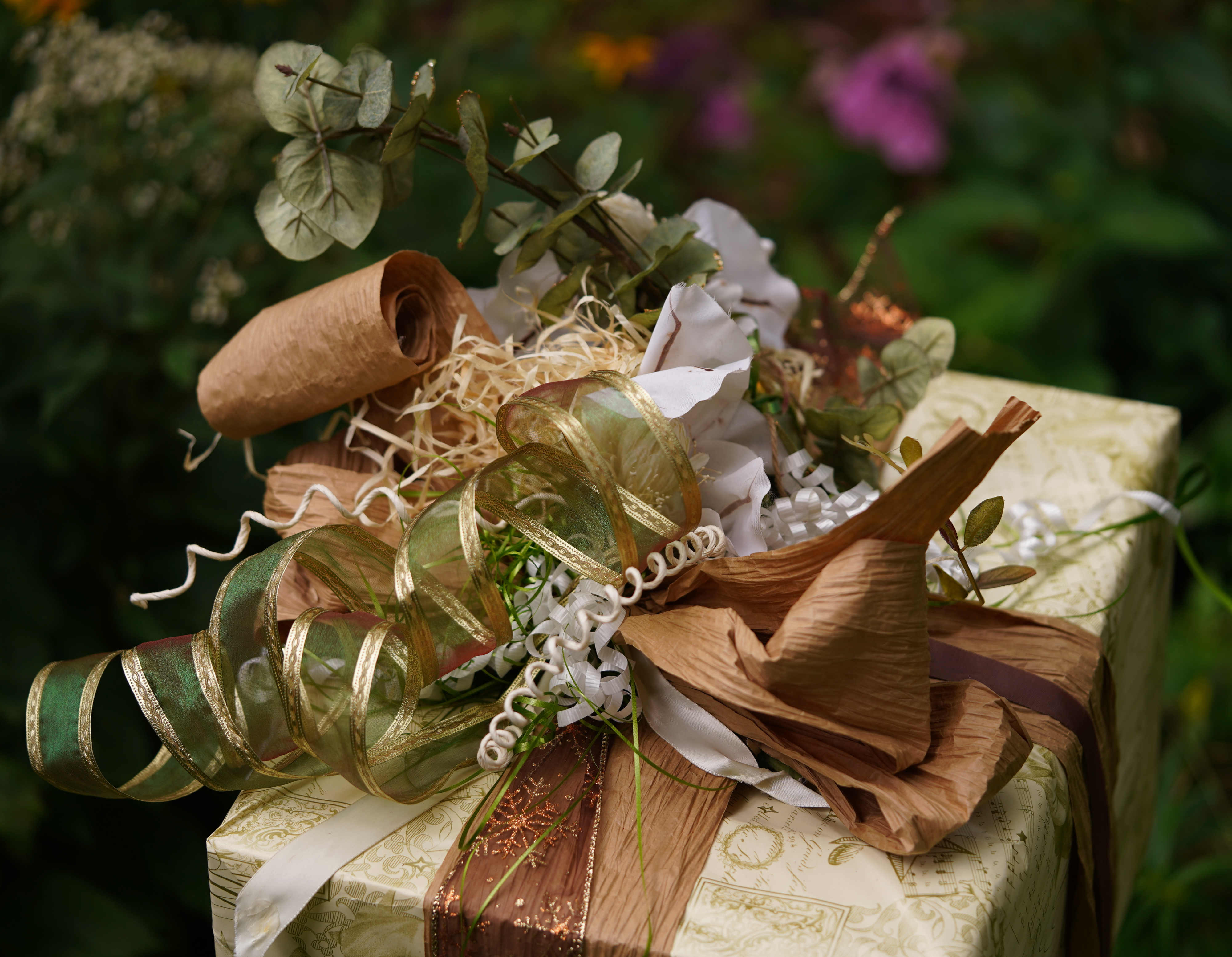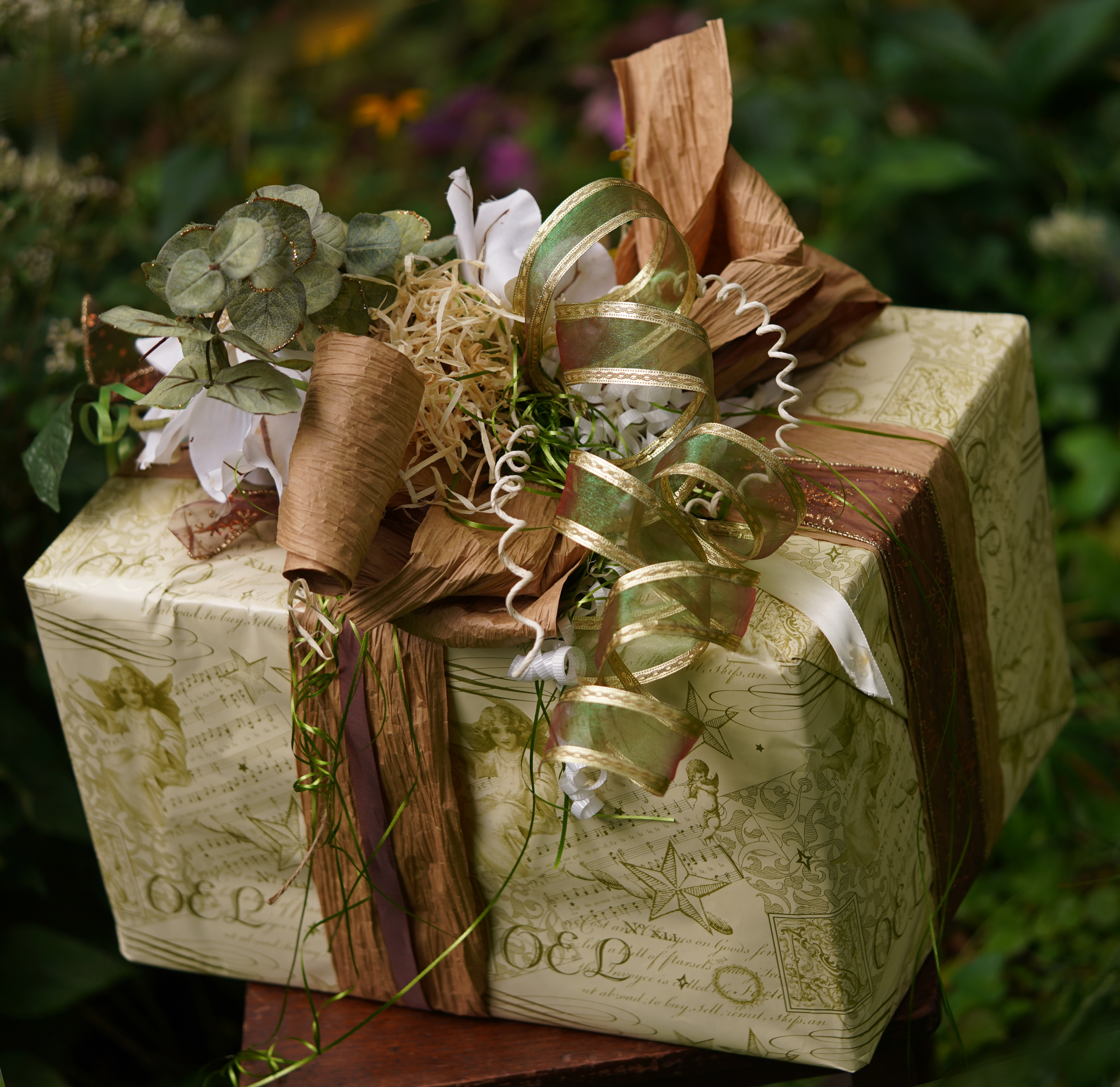 gift wrapping with silk flowers, paper, acetate?, wire edged & curling ribbons, musically themed ornament;