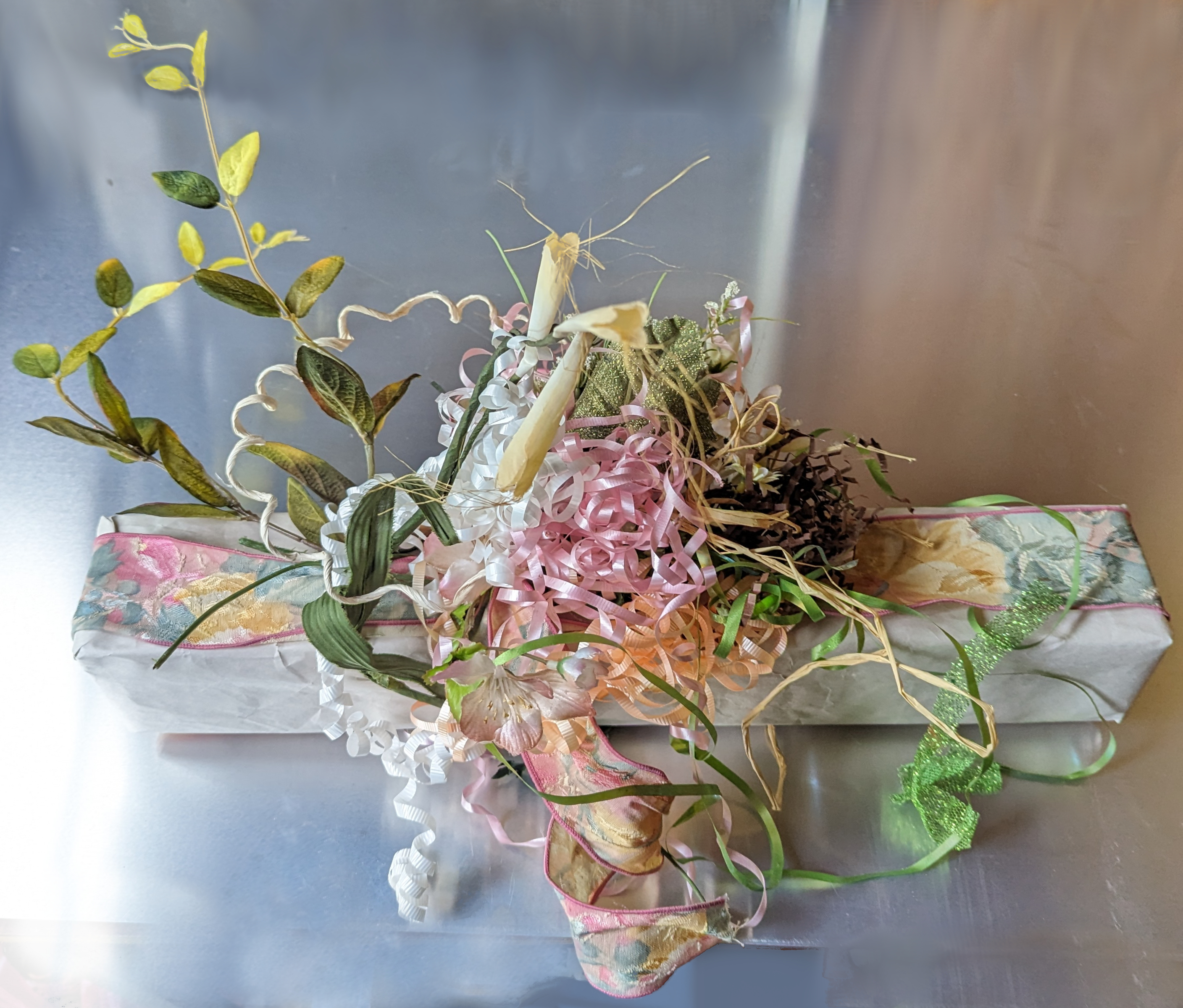 giftwarp—wire edged fabric ribbon, curling ribbon, silk flowers, brown paper crinkles; photographed 14oct23 pixel pro 6, f1.9, ev 0, 1/90s, ISO 139; lots and lots and lots of cloning, smudging, and even straight out painting of the background.