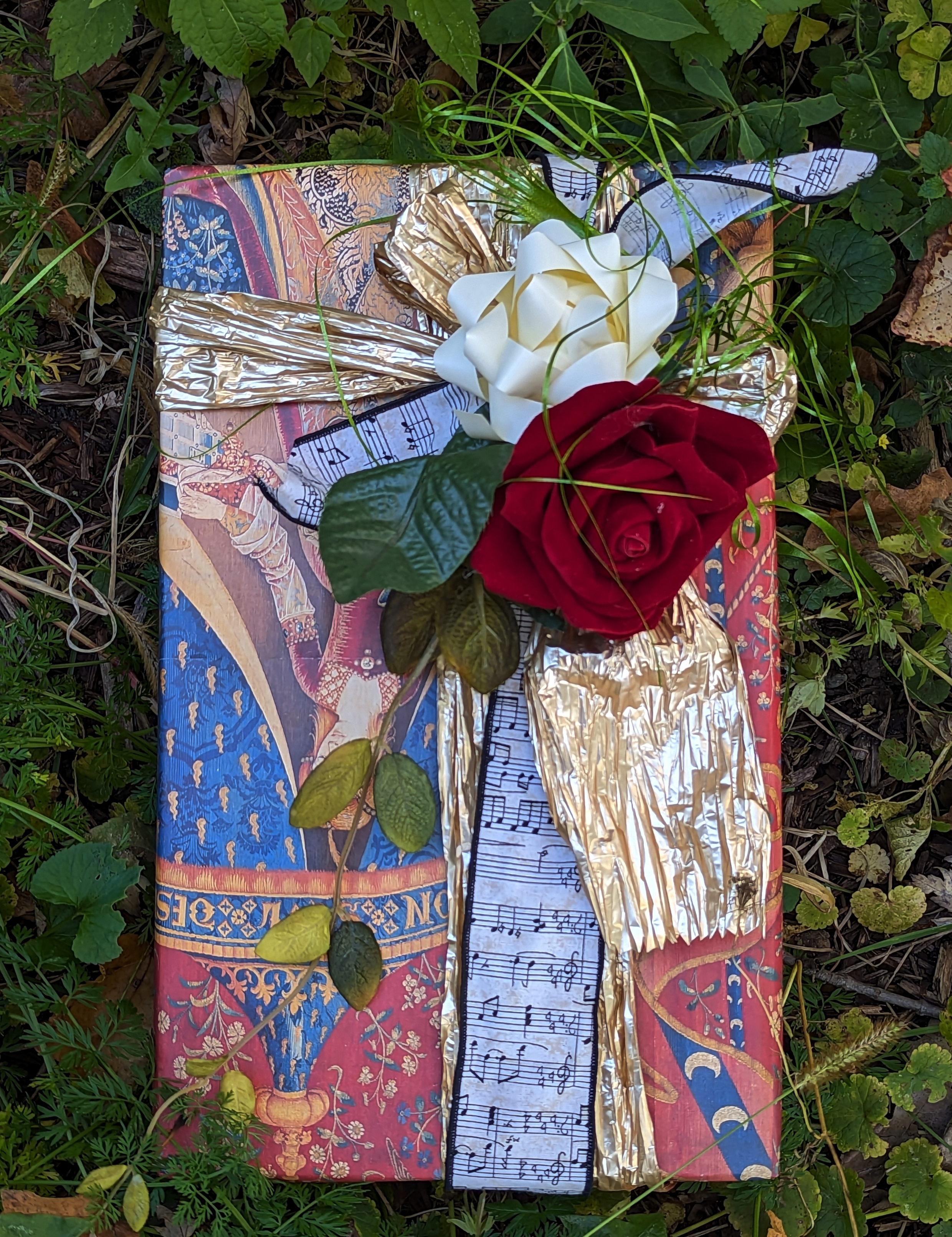 giftwrap, krinkle metallic ribbon, musical notes wire edge fabric ribbon, ripped olive green ribbon, flocked red rose, silk leaves, cream coloured bow
