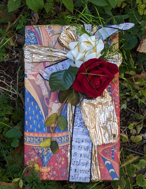Because the paper was so complex, I left the decorations much plainer to show it off. And I felt that a rose and the musical notes made for a great accent for paper that evokes (at least to my mind) Chaucerian romances and medieval contradanse music:)