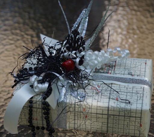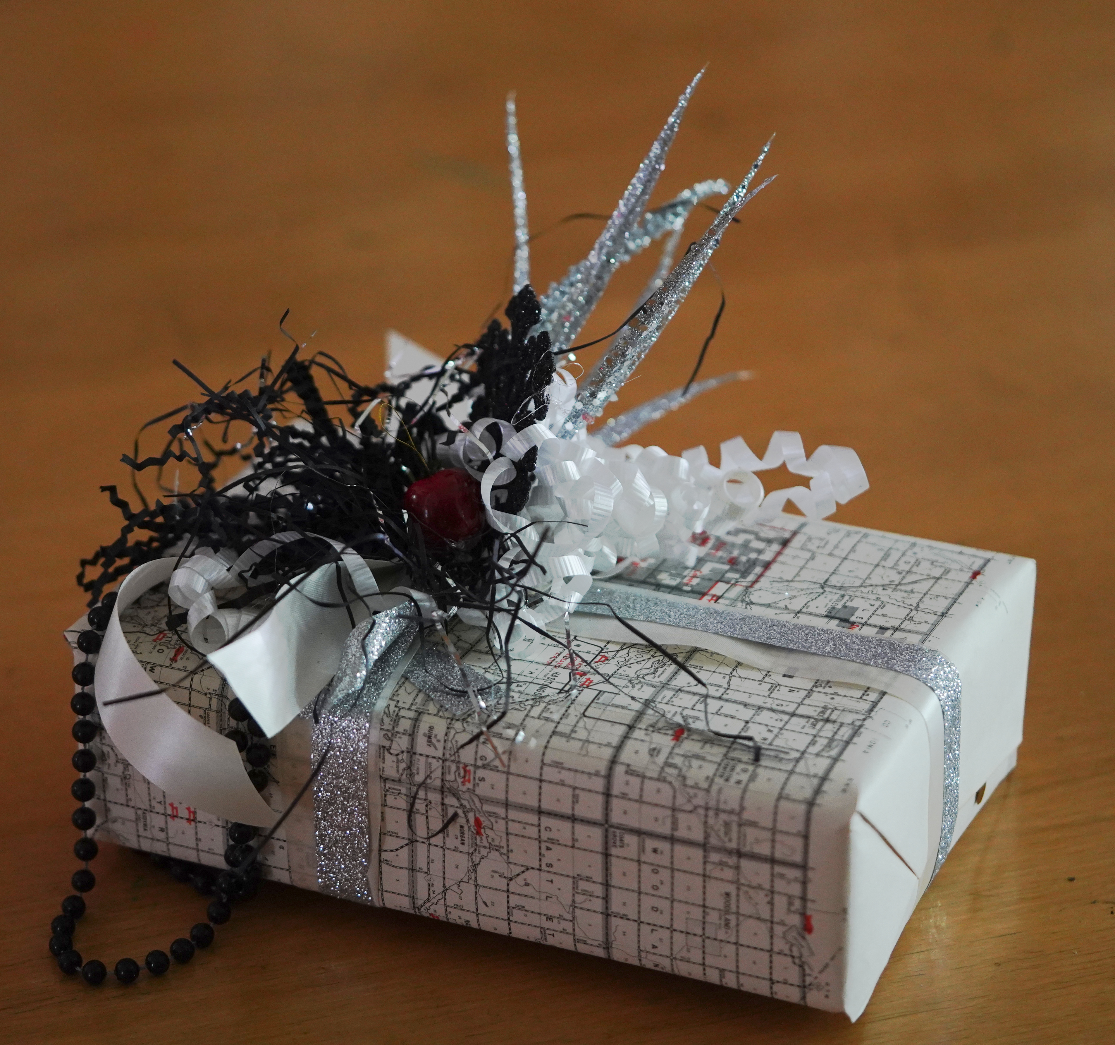 vintage map, black plastic beads & flocked snowflake, black paper crinkles, black and silver shreds, silver ribbon & decorations, white satin & curling ribbons, red apple accent; hot glue; sony ILCE 7C, 90mm sony macro lens; f/2.8 ev-0.3, 1/100s, ISO 3200; lightened & cropped in gimp.
