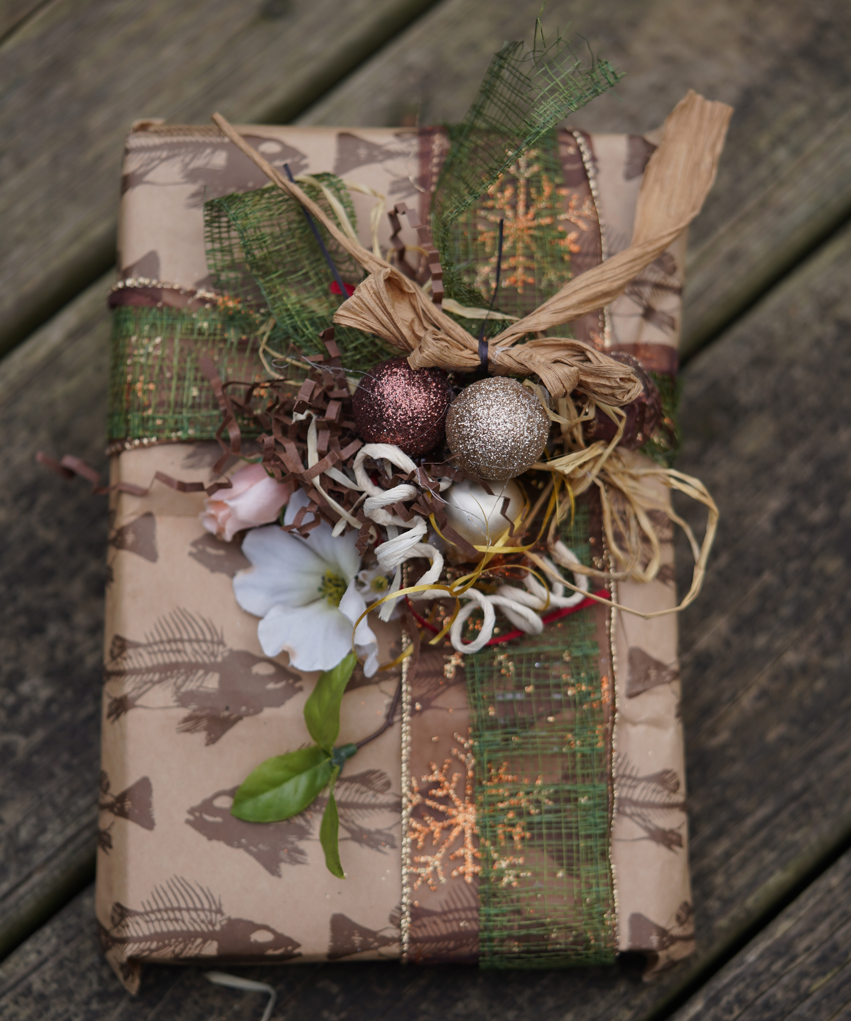 The recipient happened to admire the fish skeleton paper (one of the attic items courtesy of Page—along with the ornaments) the first time it showed up so I chose it for this gift. It had a hole where the original decorations had gotten torn off, so I just filled that with a scrap of brown paper, and centered the intersection of the two mesh ribbons (an effect I really liked) on top of that.