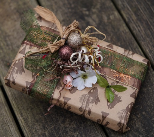 (reused) fish skeleton paper, mesh and wire-edged ribbon, paper twist and raffia ribbon, brown crinkle paper, silk flowers, plastic round ornaments, hot glue and tape; wrapped and photographed 5jan24, sony ILCE-7C, sony 90mm macro, f/2.8, ev 0, 1/160s, ISO 100, WB, daylight; cropped and scaled in gimp.