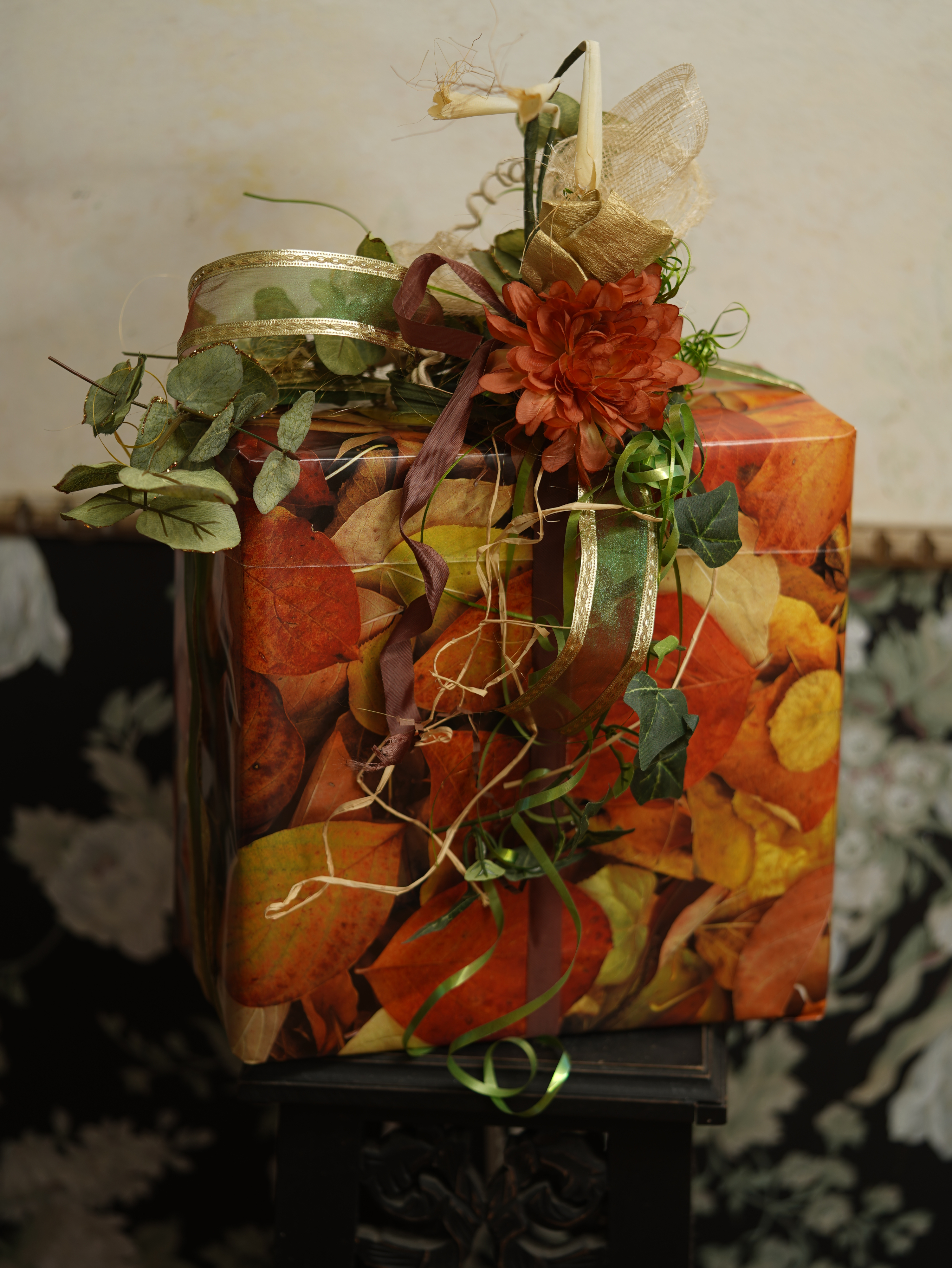 giftwrap featuring autumn leaf wrapping paper, crepe paper, assorted ribbons, silk flowers and leaves; 29nov2025; photographed 30nov25, sony A7c, sony 90mm macro, natural light; f/2.8; 1/100s, ISO 320, ev +1.0, WB: cloudy; light levels adjusted, cropped and scaled in gimp.