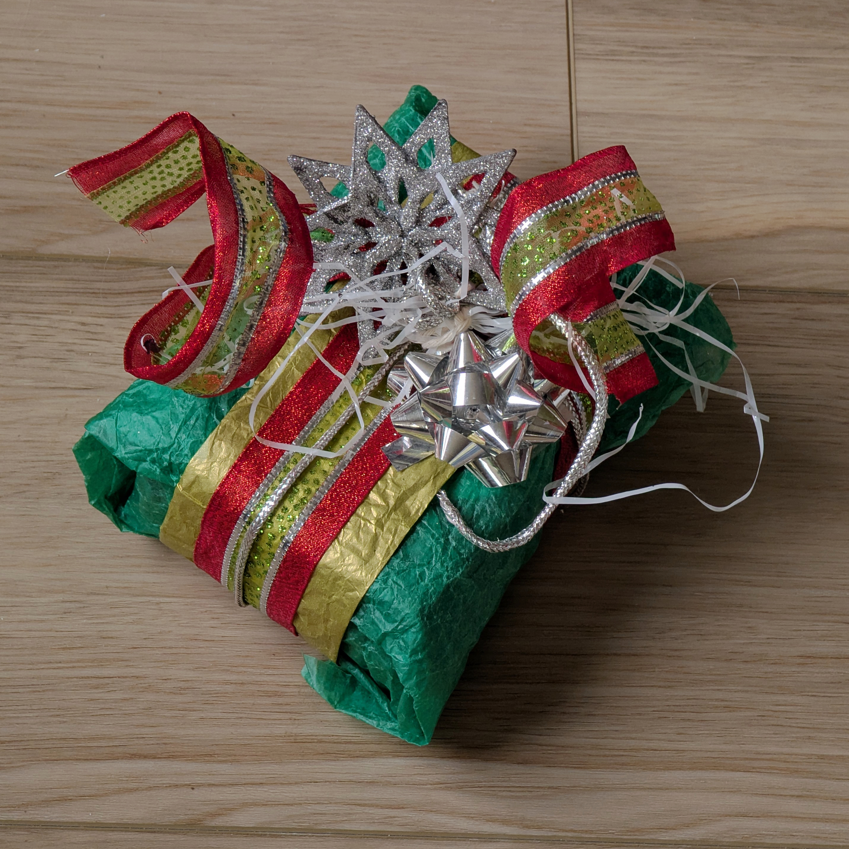 One of the giftwraps didn't survive the trip to Colorado, so I salvaged tissue paper from one of the other gifts (for Cinder, actually), rewrapped the gift, using some of the gold paper as an under-ribbon, relying on the subtle silver stripe in the red and green ribbon (plus the silver cord that is the third layer of ribbon) to tie in the snowflake and and bow with the otherwise red-gold-green colour scheme. (The original paper was silver, white and blue.)