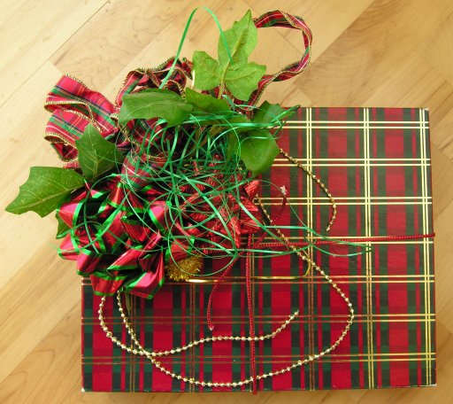 Okay, so the wrapping is really too elegant and certainly doesn't match the color scheme of the contents. But this gift box was certainly the right size, was preprinted with plaid design (no wrapping!), that already had some decorations glued to it. As it happens, I have more red/green/gold wrappings than anything else, which makes it awkward, sometimes for non-Christmas gifts—so I'm always looking for an excuse to use these up. I glued another bow or two, lined the bottom part of the box with tissue paper (I have lots of tissue paper, lovingly saved) and slipped the stocking in, put the cover on and slipped the metallic red cord over all to hold the thing shut.