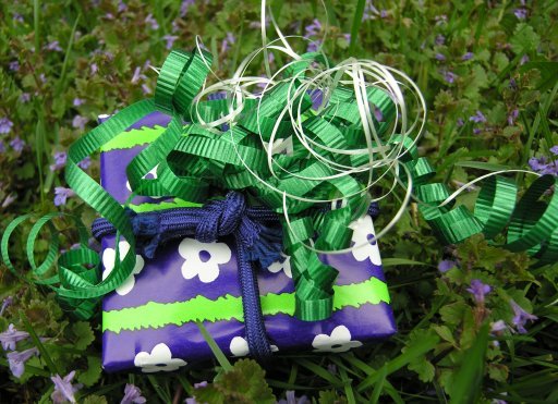 This gift measures perhaps 4” (100mm) across: it is a little chocolate box, used to wrap a bead for a neighbor who is moving away. For one thing, uncrisp corners really show on a box this small. —The paper at least had a suitably small motif, and since Laura enjoys gardening, (and there were flowers on the bead) I thought the pattern appropriate. Wonder of wonders the purple cord matched perfectly and was just barely long enough to tie into a handsome square knot, thereby providing a subtle focal point.