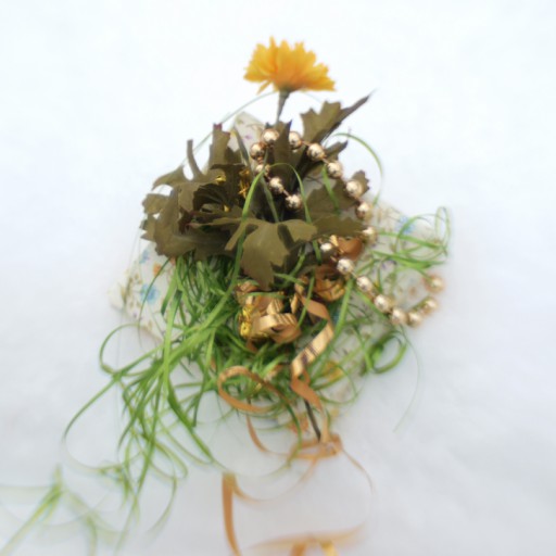 Another gift with sort of transitional sentiments with regard to the season: the paper is a delicate floral, and the ribbon is my favorite sour green that is somewhere between a pale spring green and emerald green, not to mention the bright yellow silk flower (a mum—note the olive leaves)