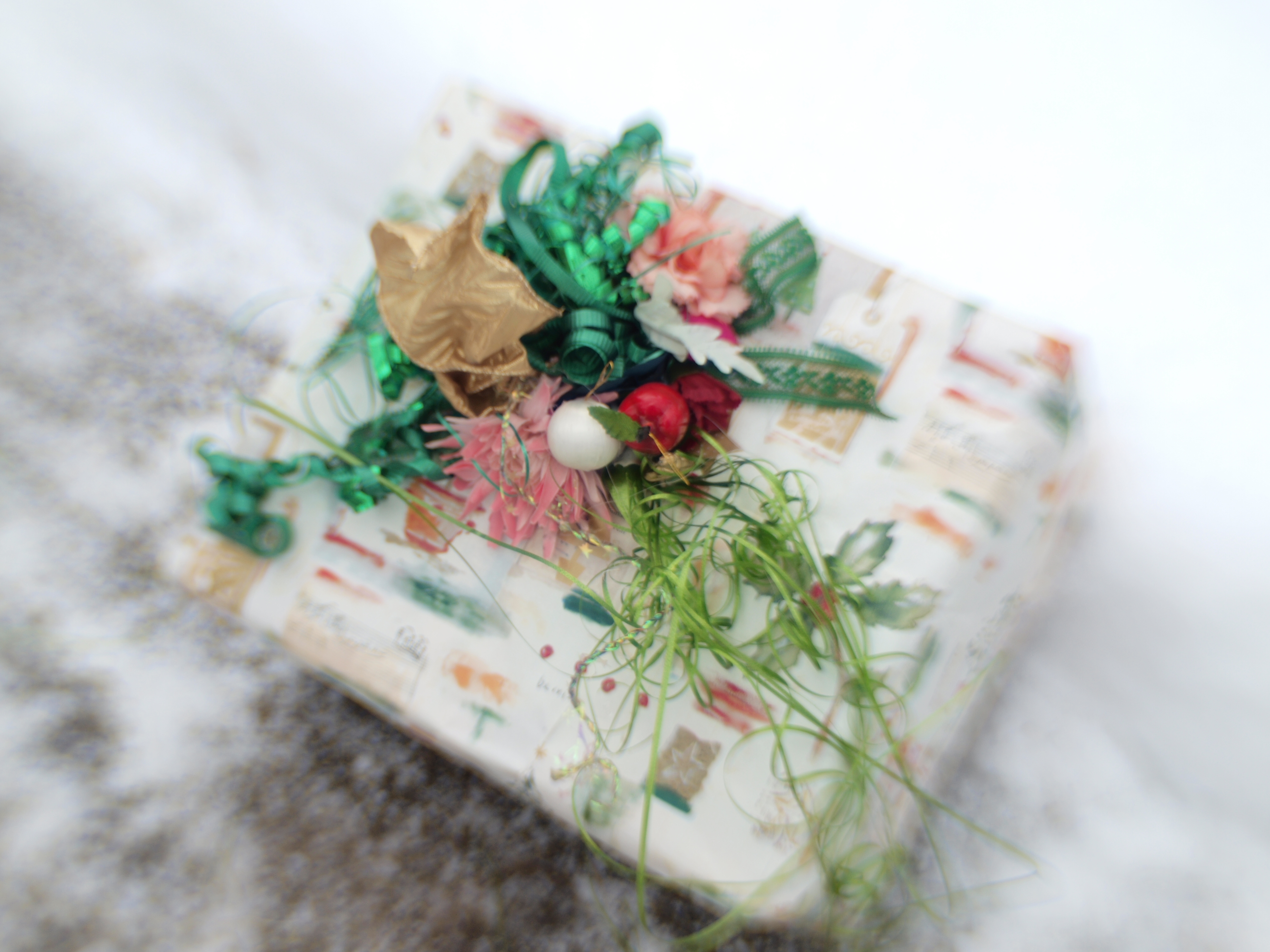 Giftwrap, dec 2012. Gold wire-edged ribbon, plastic fruit, silk flowers, white ornament, green stretch lace, curling ribbon, etc.