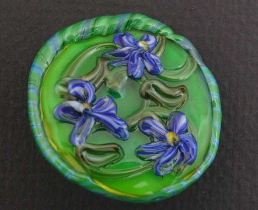 This button is another color scheme I like very much, and it's one more typically popular with my customers, but if you look at the edges you can see something rather subversive going on: bright acid yellow. Look on the other edge, just below that curving leaf coming off the top flower, and you can see the barest hint of the transparent glass, which is not green but aquamarine.