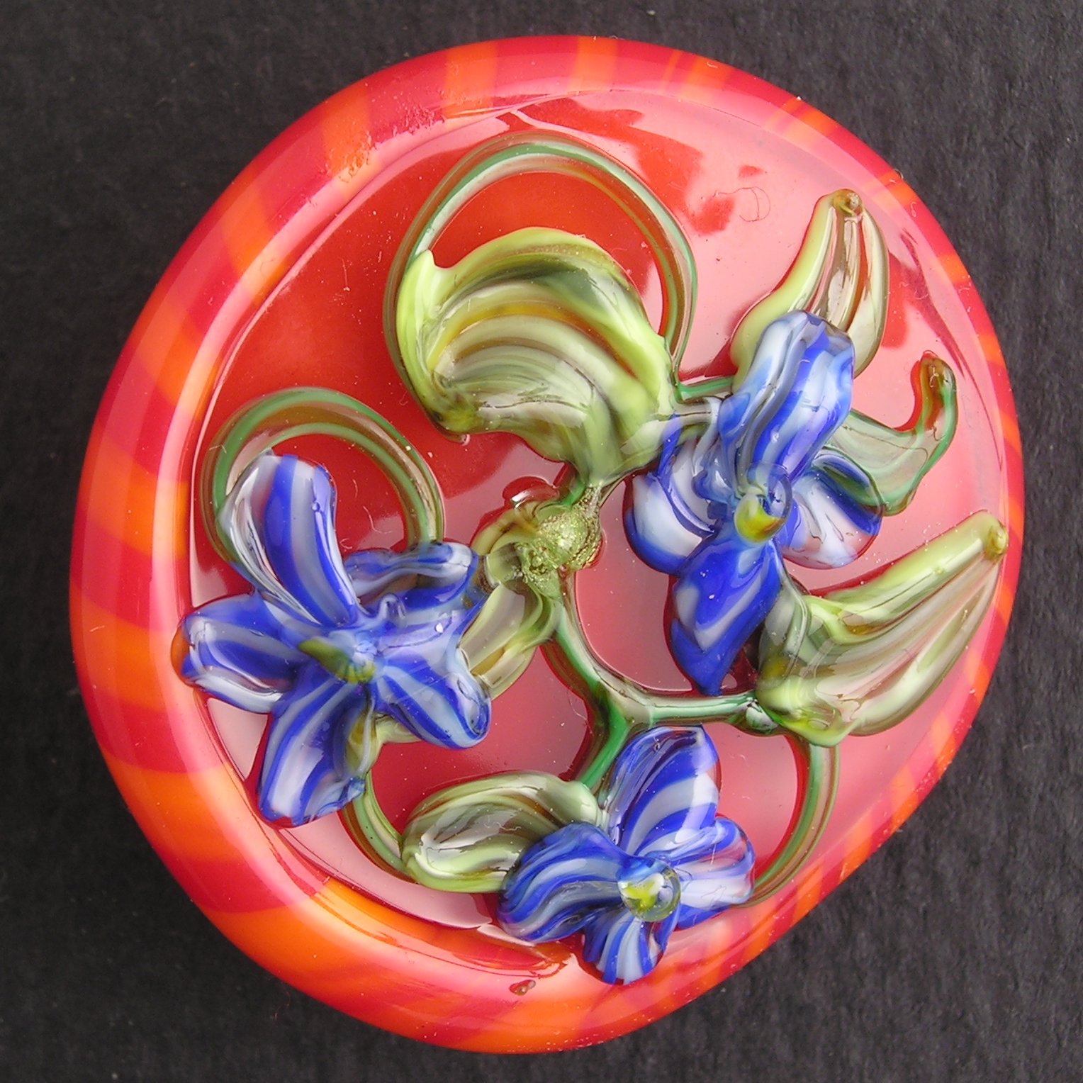 effetre soda lime, feb–mar 06. 37mm. The second button made using a combination of boro and soft-glass puntiles. Can you locate the scar of the soft glass punty? Hint: I boiled the glass something fierce:)
