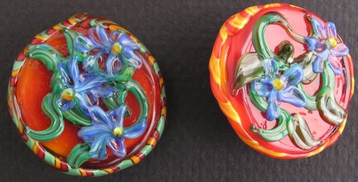 two buttons, roughly 34mm in diameter. Soda lime glass, feb? 2006. As you can see, the buttons are indeed wonky and misshapen, and therefore should be right at home on my equally misshapen garment.