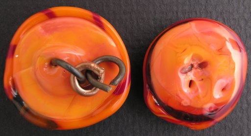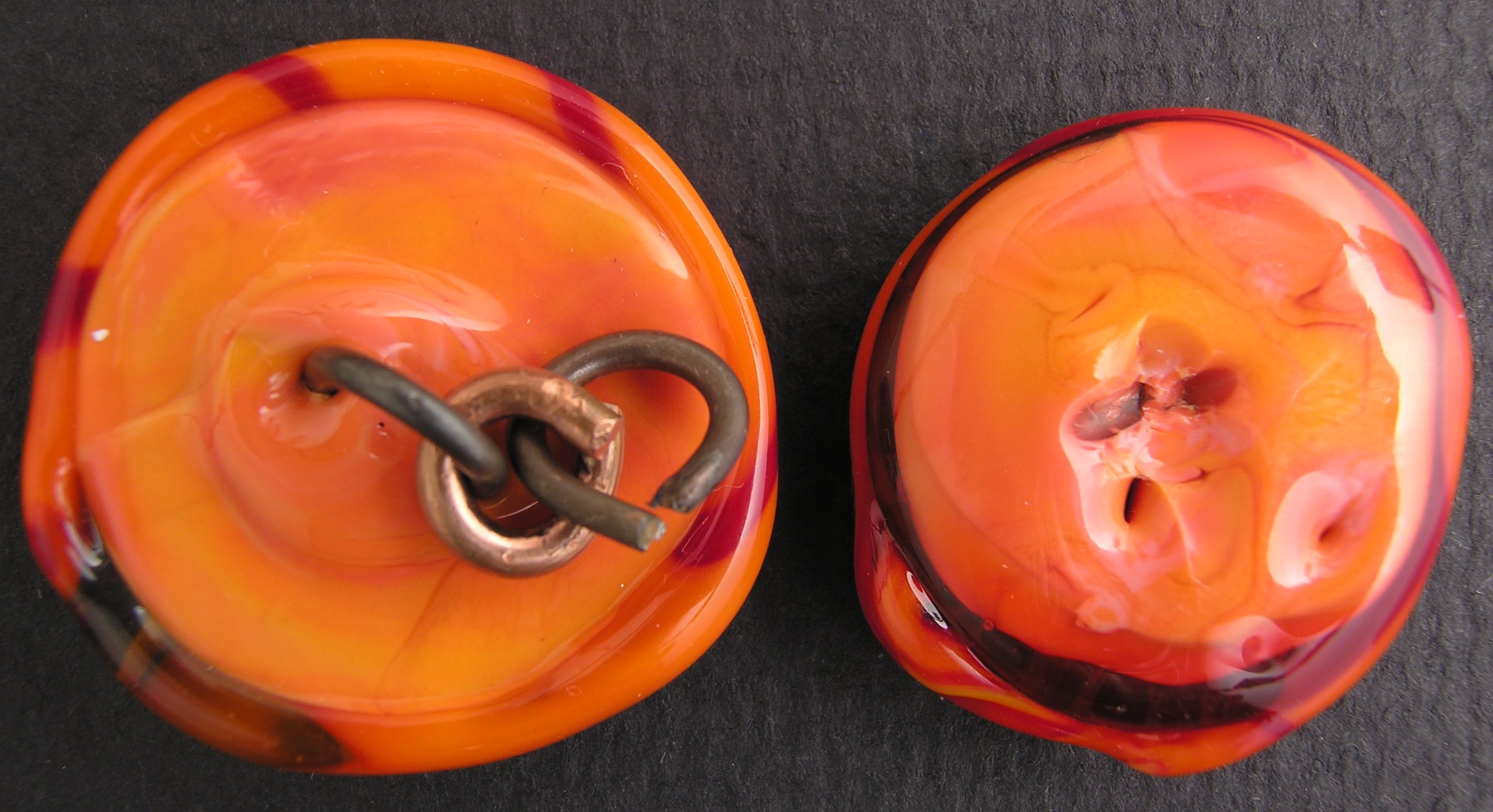 The back side clearly shows how the shank, made of .045 316 (bent) mandrel wire just ripped right out of the glass. The connecting link is copper, ’cuz I had fantasies of soldering it closed, till I realized there was no way I could get a torch flame in there without cracking both the buttons. Duh. Given that the shank for another button out of the total of 4 I made for the vest is loosening already, I'd say my test, currently with a 50% failure rate, would indicate that steel wire shanks are Not A Good Idea.